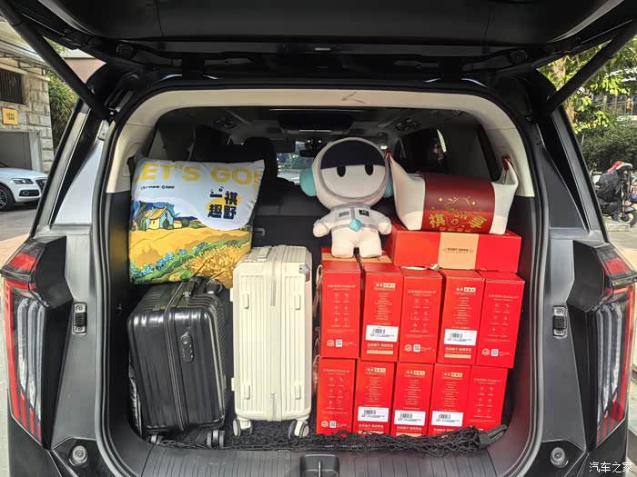 第三排的空间也完全不用担心,我180cm的表弟坐在那里也能舒展自如。这次春节回家,我们一家七口人,再加上满满当当的年货,车内依旧宽敞舒适,没有丝毫的拥挤感。说到年货,就不得不提传祺E9宽敞的后备箱。过年回家,给长辈的礼品、给晚辈的零食玩具,还有各种生活用品,都被我一股脑儿地塞进了后备箱。它的容积很大,而且内部很规整,东西放进去一目了然,取放也非常方便。就算塞得满满当当,关上后备箱依然轻松,完全不用担心空间不够。