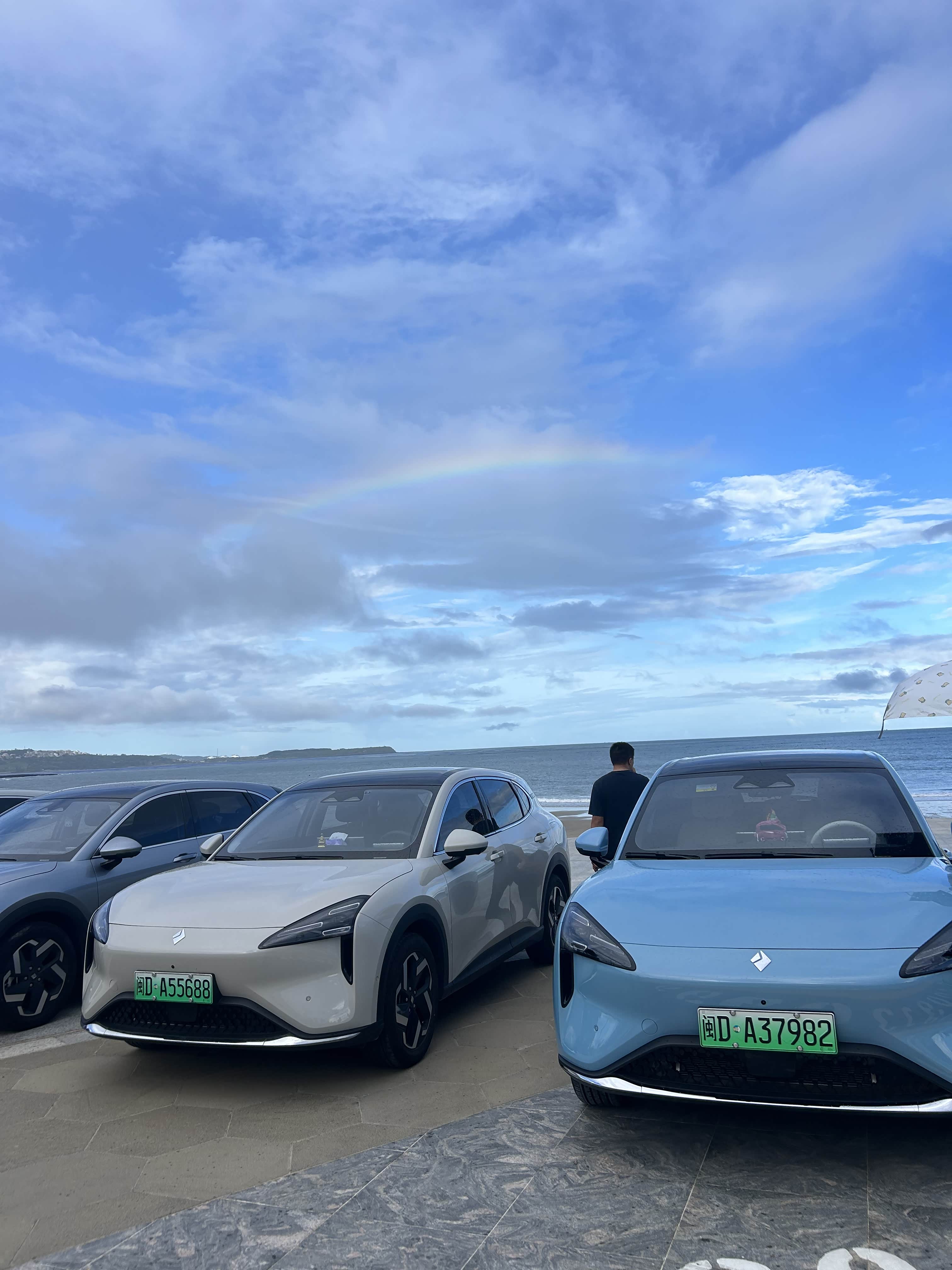 车辆行驶在公路上,起初天空还算明朗,可没一会儿,雨滴就淅淅沥沥地落了下来,敲打着车窗,发出“噼啪”的声响。大家心里多少有些忐忑,担心这雨会影响到后续的行程。但好在,雨只是短暂地“逗留”了一下。当我们抵达漳州火山岛时,雨竟然停了,天空像是被水洗过一般,格外澄澈。更让人惊喜的是,一道绚丽的彩虹横跨天际,像是大自然为我们这次行程特意准备的欢迎礼。那彩虹色彩斑斓,红、橙、黄、绿、青、蓝、紫,层次分明,一端仿佛扎根在海里,另一端则伸向远方的天空,美得让人移不开眼。大家纷纷拿出手机,记录下这难得一见的美景,喜悦之情溢于言表。