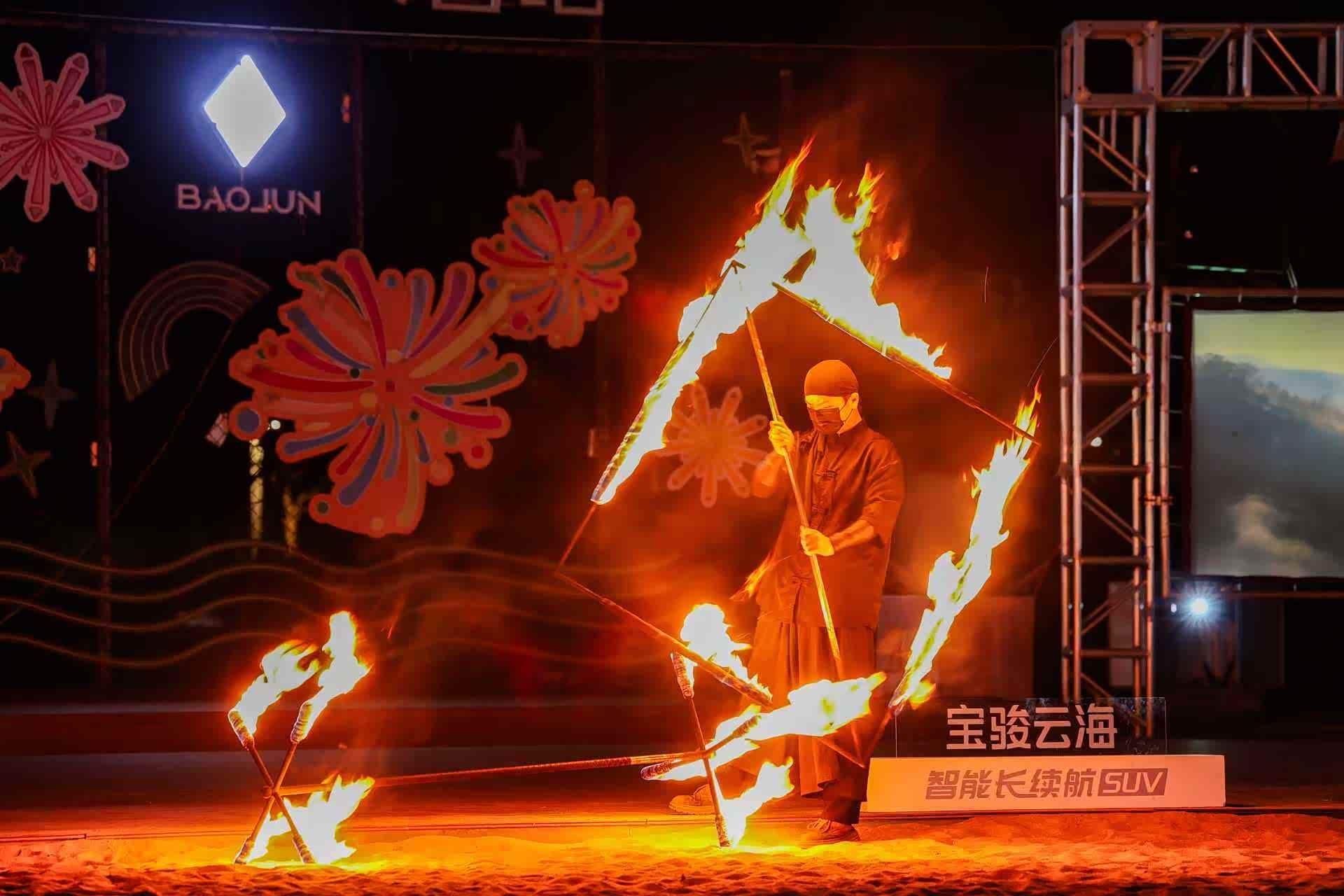 不知不觉,夜幕降临。晚上的火山岛更是热闹非凡,精彩的火焰表演如期而至。熊熊的火焰在夜空中舞动,像是有生命的精灵,伴随着动感的音乐,不断变换着形状,时而像绽放的花朵,时而像腾飞的巨龙,绚丽的火光映照着每个人的脸庞,大家都被这震撼的表演所吸引,发出阵阵惊叹与欢呼。