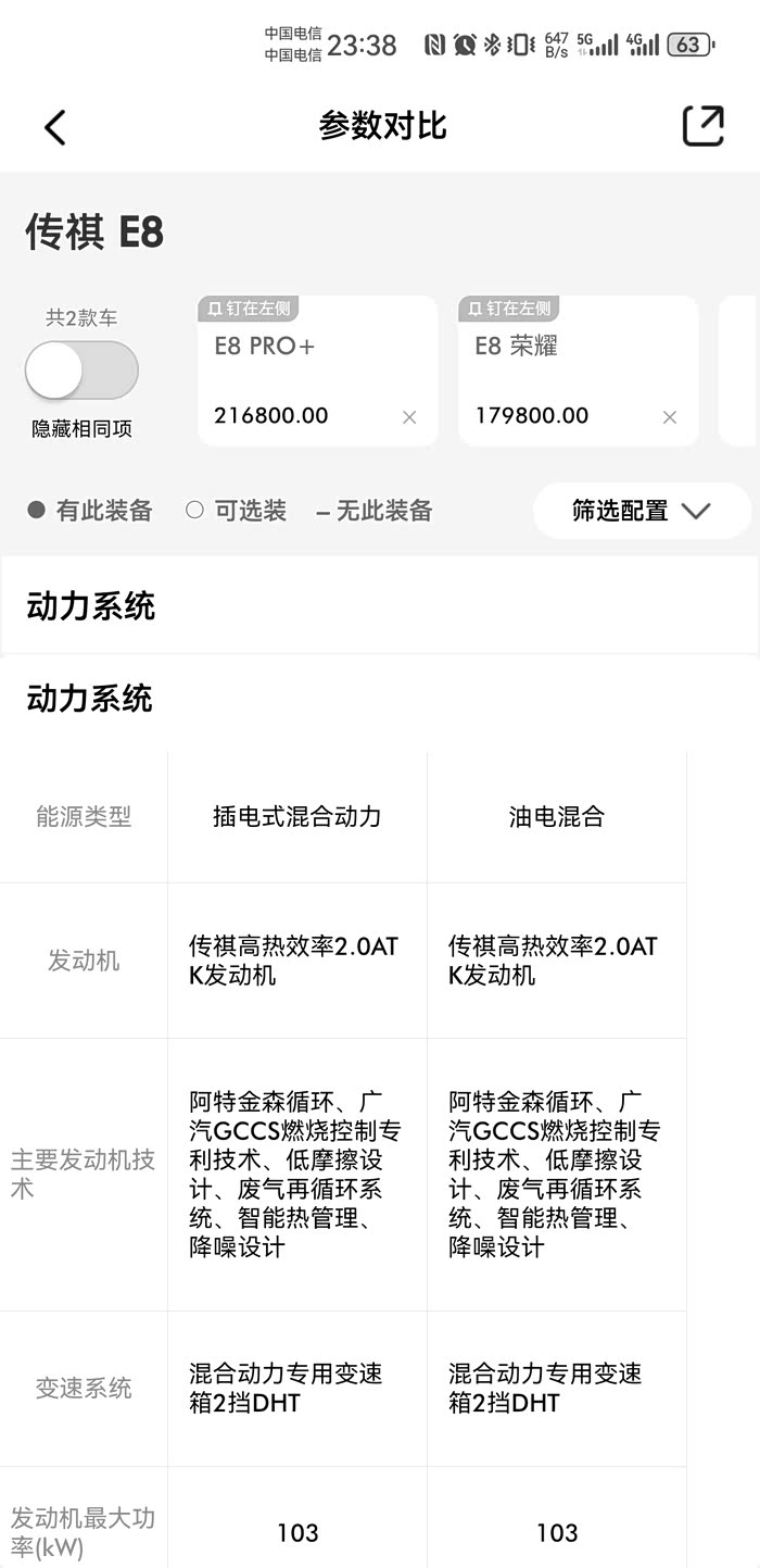 - 荣耀版:砍掉了插混系统,改用2.0L油混,发动机140马力+电机182马力,综合油耗5.58L,加油不充电。