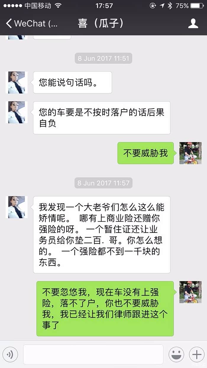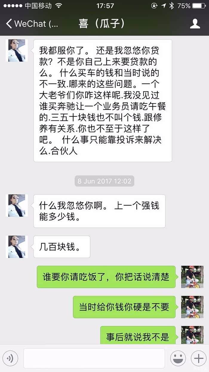第七个,车寄回湖南上牌,上牌时候居然得知我这车没有上强险。。。。原来他们给我把保险降低到7000是玩了文字游戏,只给我商险,投诉他们,可是,发现投诉无门,他们销售很强硬告诉我说这就是他们的规定。。。而且还发来这样一句话,我真是无语,因为吃了他们销售一个汉堡(意思是我没有给他钱),被他黑出屎,还极度被他们质疑我,可明明是他们销售到饭店硬要给我买饭。。。我一个买得起的AMG的人会去贪一个汉堡包的便宜。。。。。