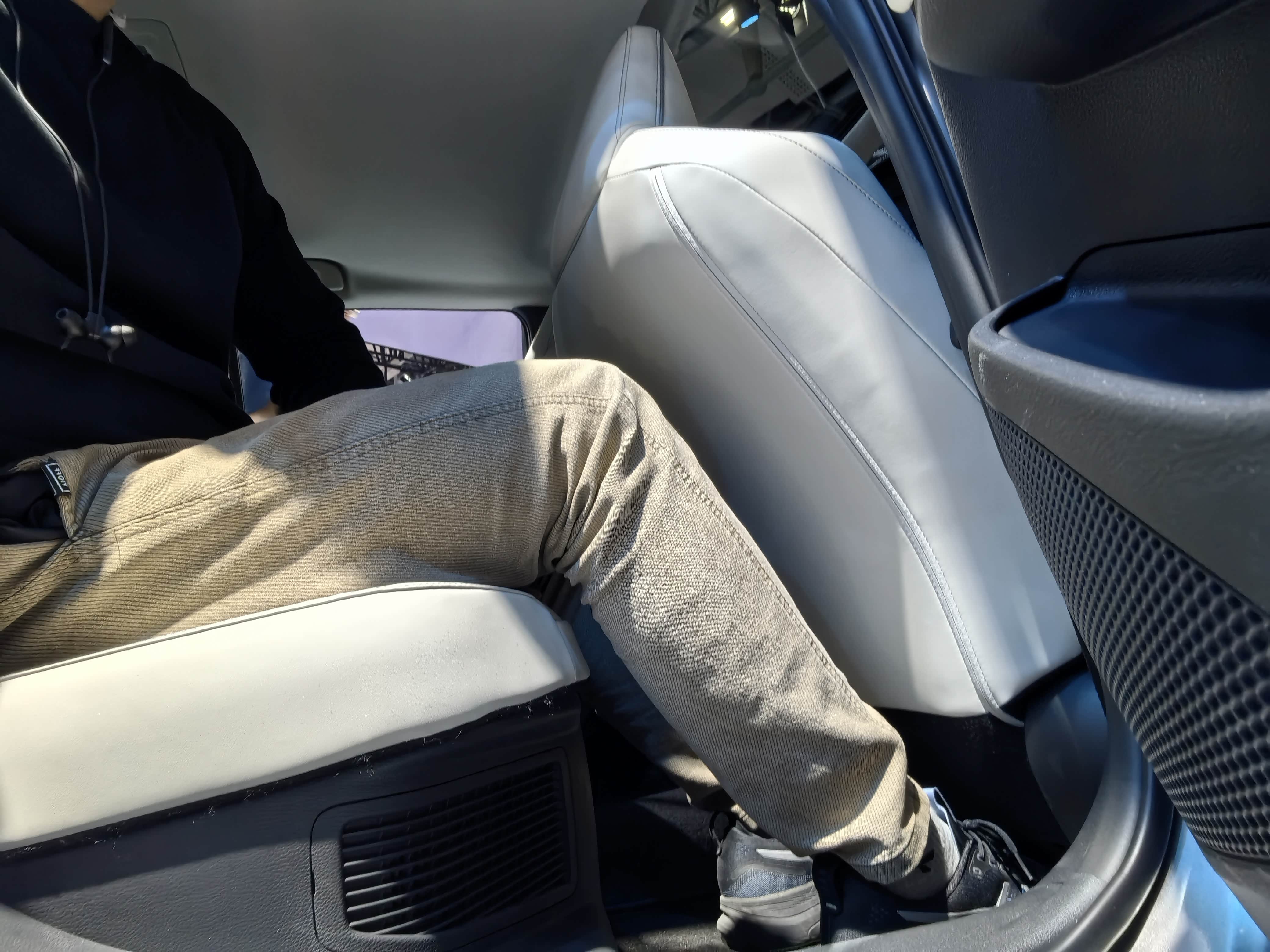 ②保留第一排座椅我乘坐最佳位置后,我坐第二排头部空间有3指距离,这里仅限躺平,如果是坐立起来头会直接碰到顶部,前后排距离是有4指左右距离,这两点还是挺不错的。另外有点惊喜的是,膝盖与座椅边缘还是可以紧密贴合的,支撑是够的。