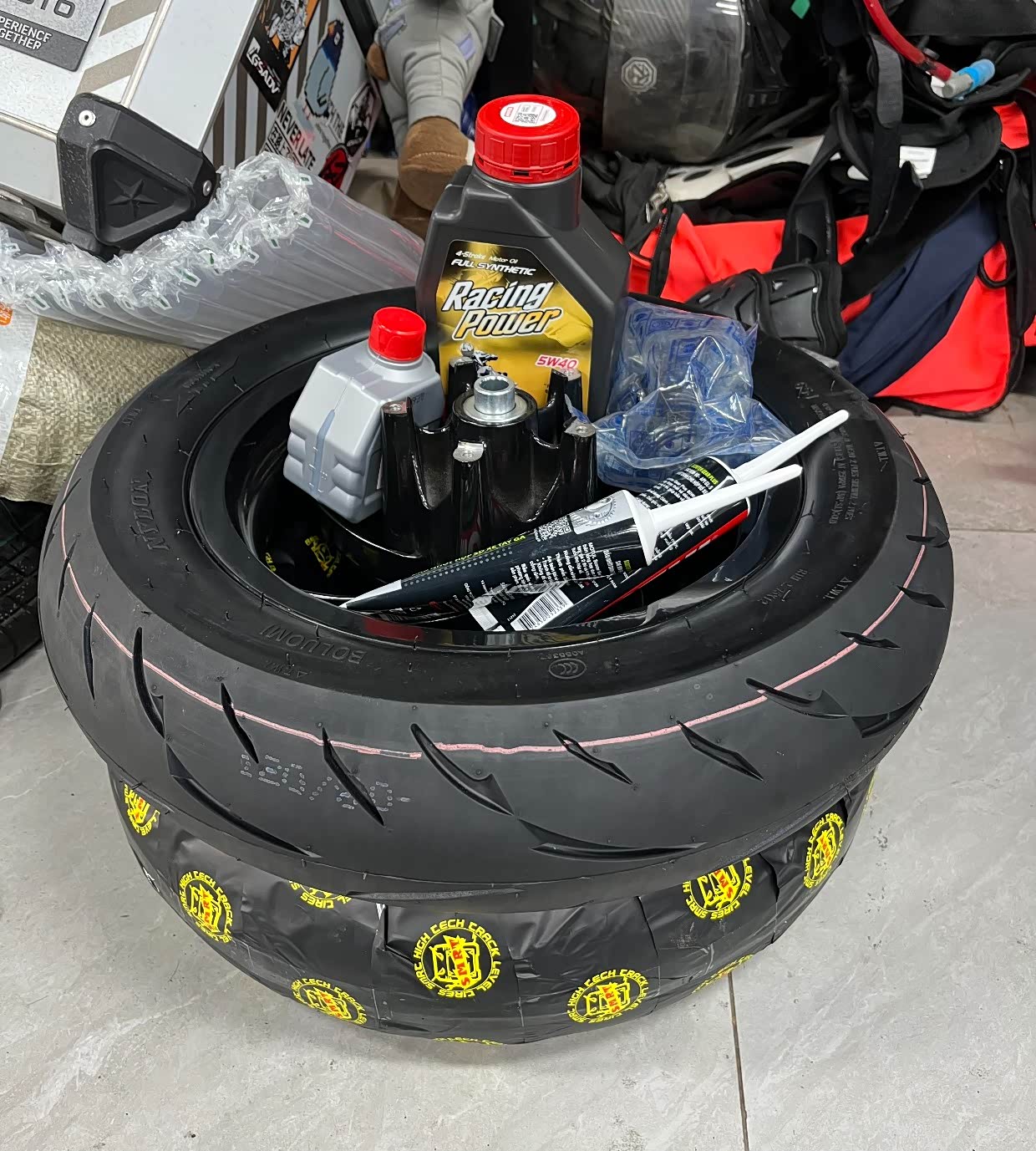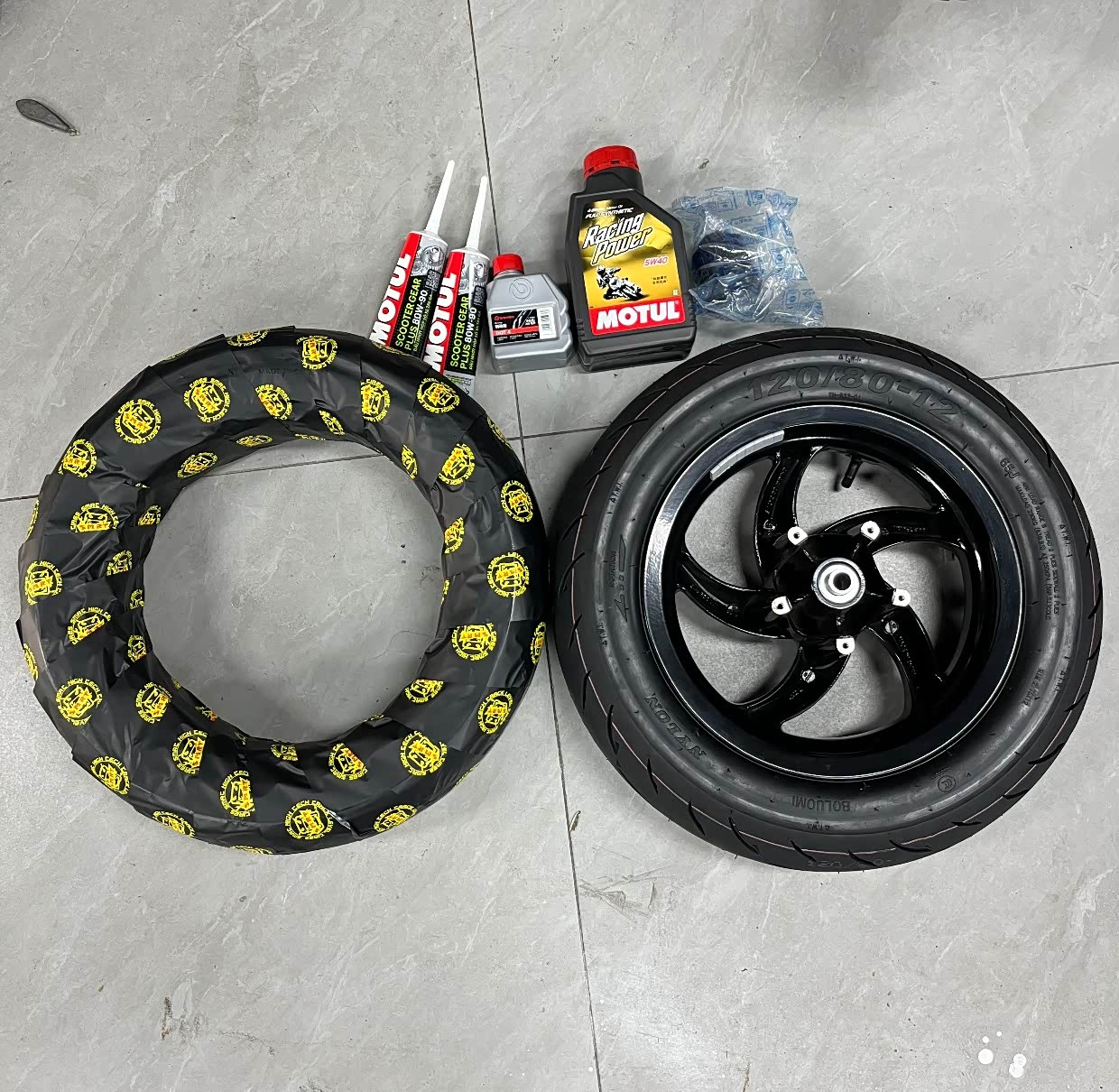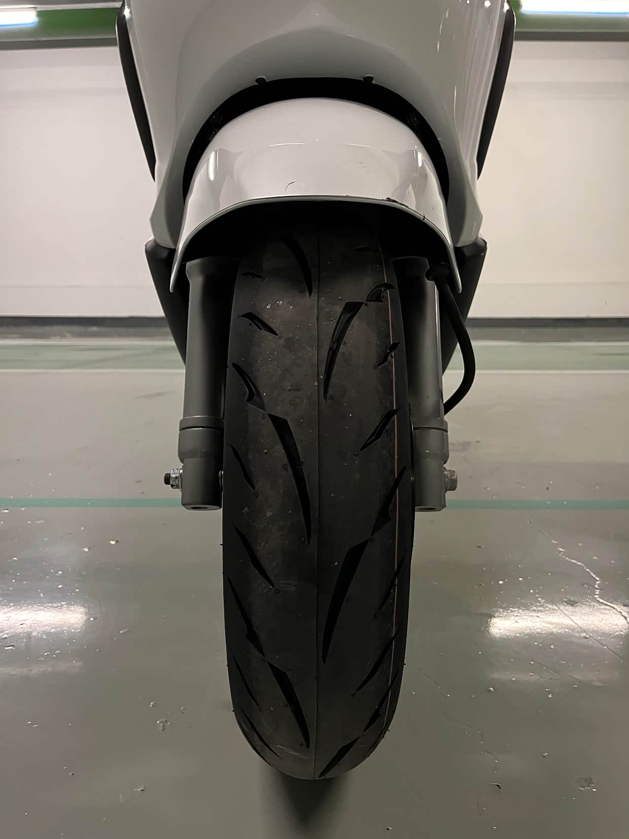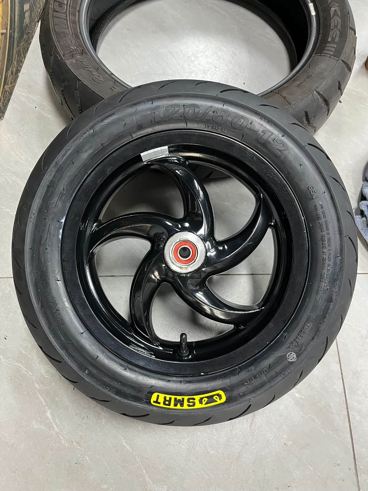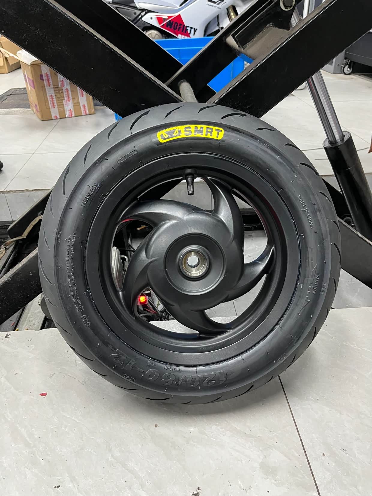 后轮毂因为跟老台风一样都是3.0J的 所以沿用 前后轮都用的SMRT 120 80/12半热熔轮胎