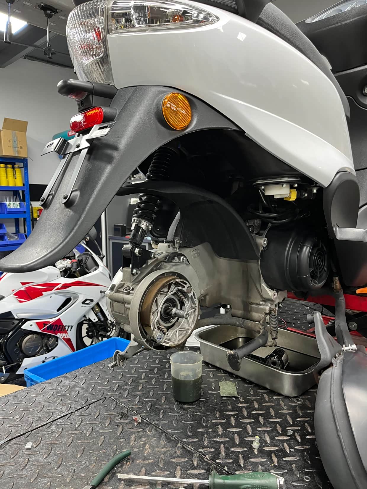 严重吐槽比亚乔的设计师 齿轮油放油螺丝居然在传动箱背面 想放油要先拆排气 再拆后轮 极其繁琐
