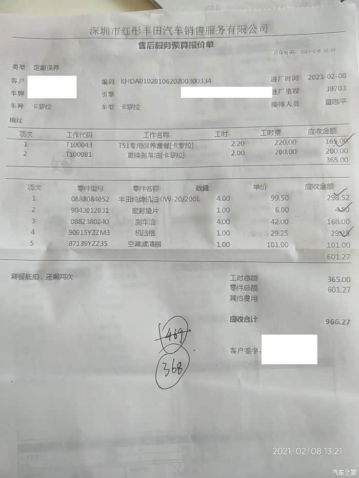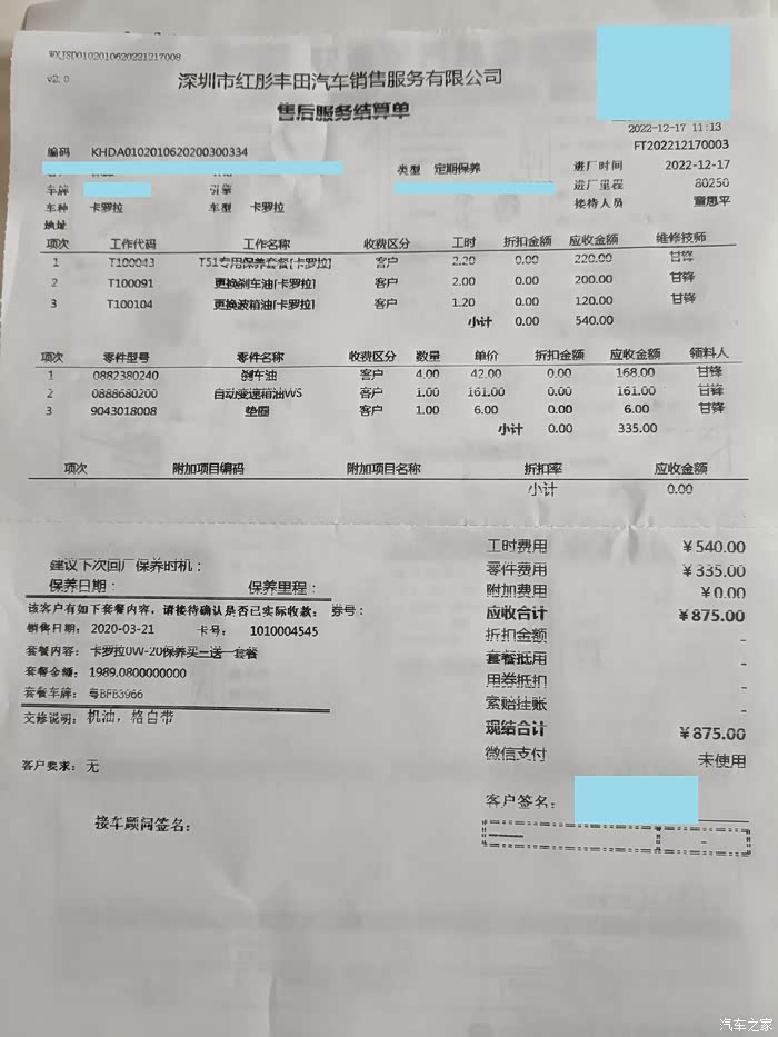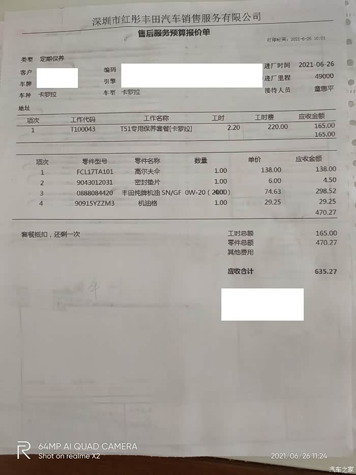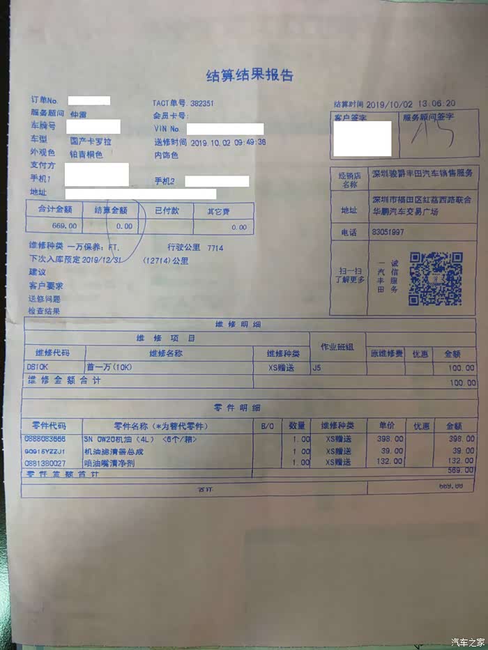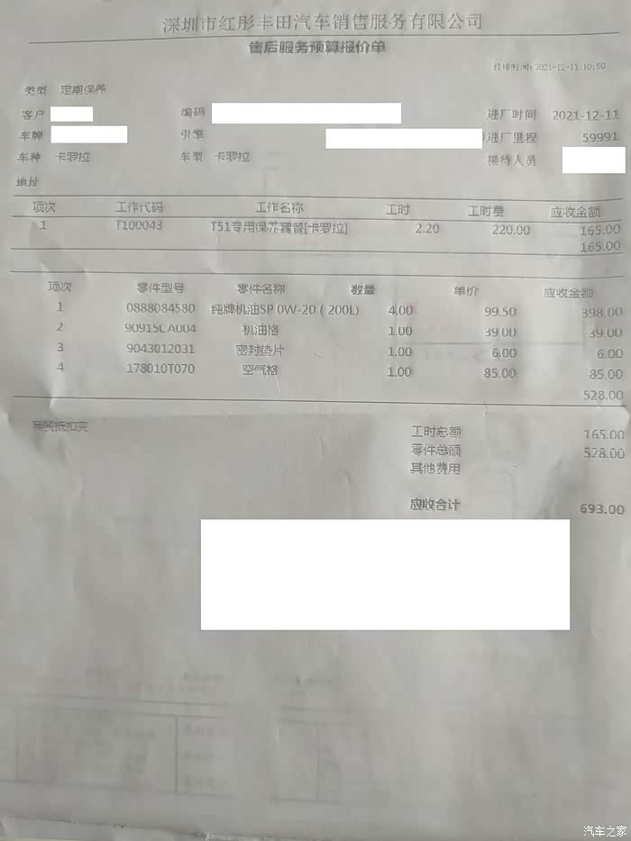 1.在我询问为何多了油泥滤芯项目的时候,直接就说不做这两个项目会影响后期的车子质保,因为我的其他车友在保养的时候也未曾提及有关这些项目,所以我认为这是强加给我的保养套路,而且接待员还跟我说插电双擎比汽油车保养费用高很多,比RAV4还高,真的假的我不知道,反正觉得有些夸张了。