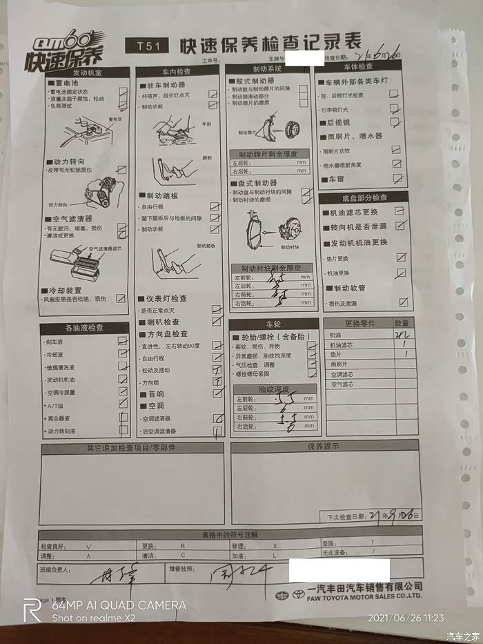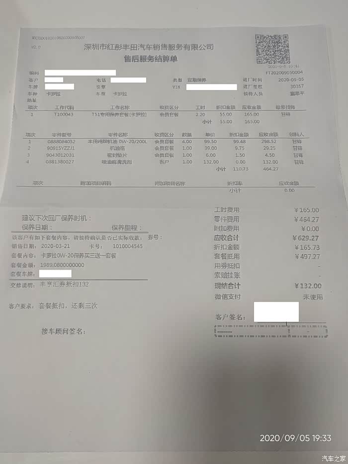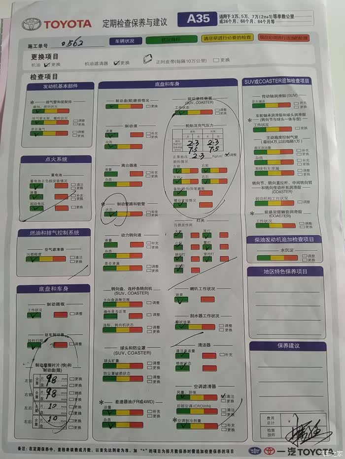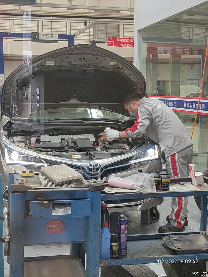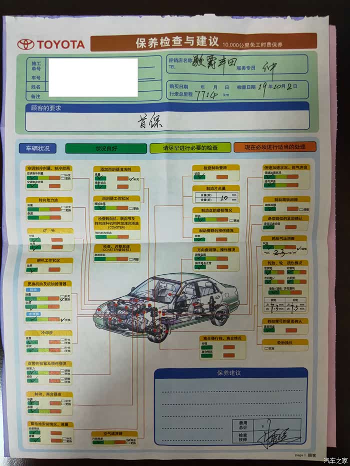 2. 在进行填写保养项目时,建议我使用喷油嘴清洗剂(这个是正常的,因为保养说明书中有写),因为我平时使用红线S1燃油添加剂进行保养(这个燃油添加剂的成份与丰田的喷油嘴清洗剂成份相同,而且清洗的效果更好),就拒绝了再使用喷油嘴清洗剂,讲明原因后,接待就没有再强求使用(上次骏爵丰田的接待直接就说不适用不保修之类的话),这一点就令我很满意。另外她还建议我做刹车保养,说实话3万公里的里程确实需要检查一下,因为这是插电混动车,有动能回收功能,所以刹车的使用没有汽油车多,我觉得4万公里再做刹车保养也可以,所以这次也没有打算做。
