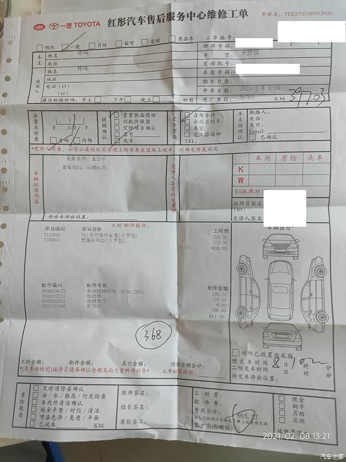 4万公里的里程,保养手册要求除了换机油机滤以外还要更换刹车油,而且这个里程的保养有很多要检查的项目,所以这次保养还是去4S店去做最好。这次去红彤丰田4S使用套餐中第二次保养,外加自费的更换刹车油368元。接待员没有给我推荐保养手册外的其他保养项目,这个令我非常满意,该保养什么就保养什么,不忽悠就是最好的!