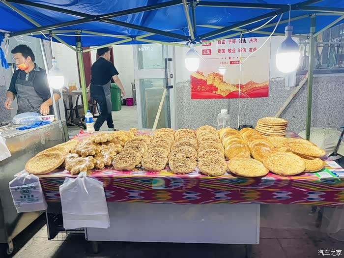 首先进入夜市就能看到各种各样的馕,有芝麻馕、皮芽子馕、辣皮子馕、玫瑰花馕和核桃馕。这些馕很好理解,就是内馅儿是啥就叫啥馕。