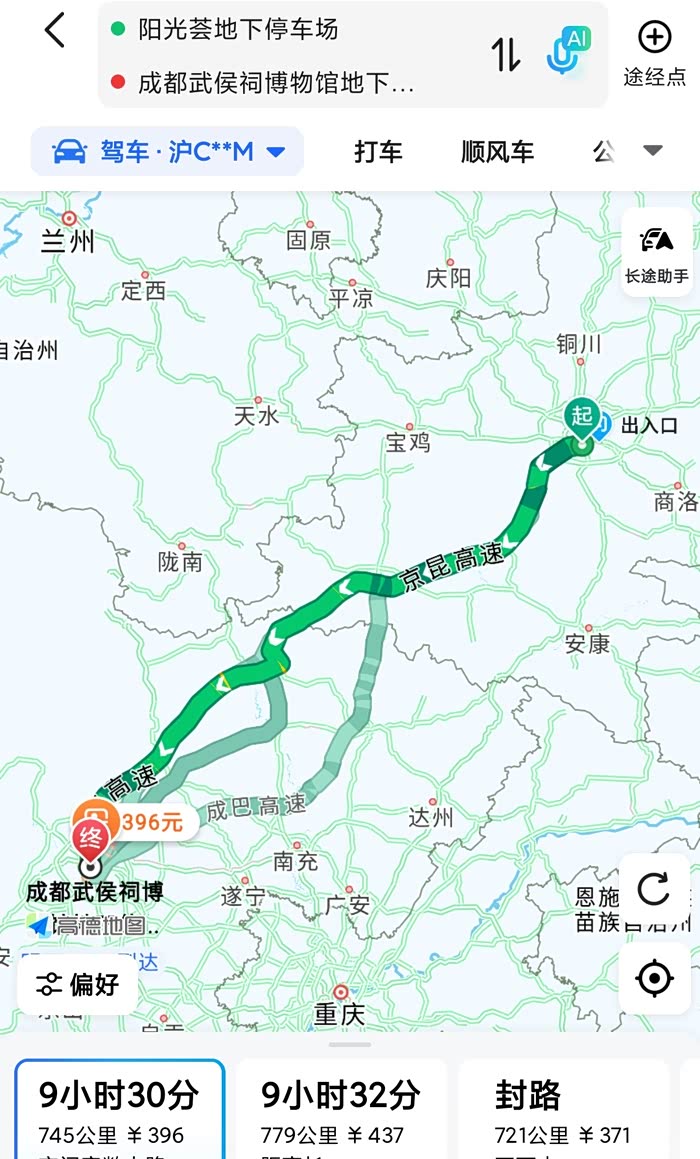 接着我开始规划路线。我用手机上的高德地图规划了路线,对比后选择了最优方案,走京昆高速(G5)和包茂高速(G65),全程约745公里,预计驾驶时间10小时左右。我还标记了沿途的服务区位置,特别是绵阳和广元附近的服务区设施比较完善,适合休息。