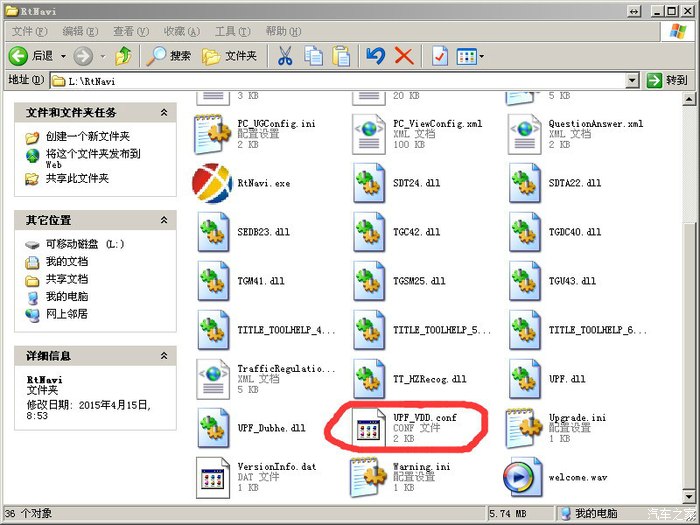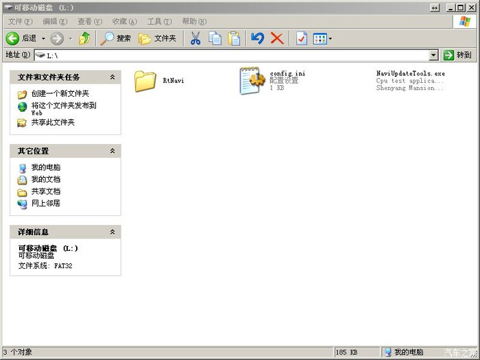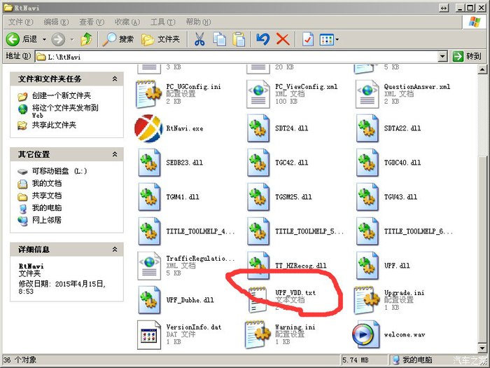 把导航文件和升级程序文件复制到U盘的根目录。复制完后,打开U盘文件列表应该是下面这个样子(盘符L:可能不同,这个不用管)
