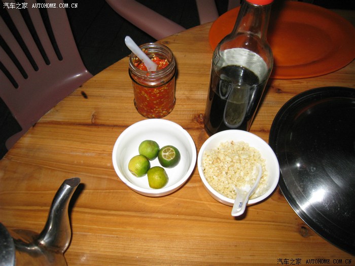 这个是做蘸碟的,辣椒、酱油(那边叫老抽)、蒜泥、小桔子(外观比较青,但绝对不是我们这边超市卖的小贡桔哈,味道有点奇特,是直接用手指,挤里面的汁到碟里的,皮不用的,丢掉,做成蘸水味道很好)