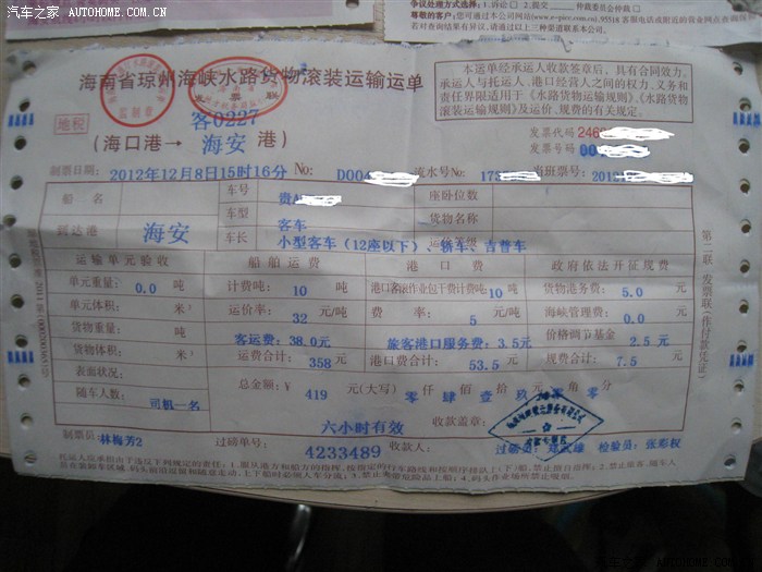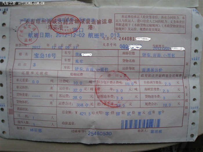 轮渡费用为海安至秀英为车辆带一司机收费421.5,我老婆一旅客收费42.5元,保险20元,计484元。