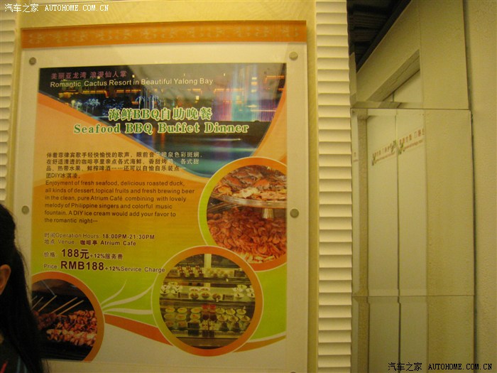 酒店电梯内介绍BBQ自助餐的海报,在这里买是188元/位,再外加12%服务费哦,网上定是178元/位,没加服务费。这个电梯是两面开门