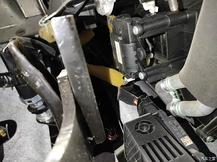 最近的仪表盘老是产生擦擦擦和吭哧吭哧混合的奇怪异响,刚开始还以为是冷却液流动的声音呢,后来发现不是。车友群里有车友说冷暖风门控制马达也会异响,自己便钻进主驾驶位的地毯出查看一下,发现这个马达果然会一动一动的异响。