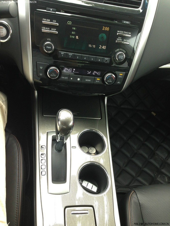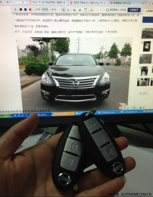 后来就把订单转让了,回头就去看备选三车中的另外两个,经过最终的试驾和比较,选中天籁,最初我是考虑购买天籁2.5领先,结果去4S店的时候,老婆坐进公爵后一下子就被吸引住了,表示出了强烈的喜爱,然后的然后我就顺从了,毕竟车子以后是给老婆开的,她满意最重要。7月5号在4S店下的订单,当时4S店有三辆荣耀现车,都是4月底生产的,一台白色(在我提车的时候,被一位去观赏我车子的哥们半个小时谈完订走了),两辆黑色(内饰正好是深浅各一辆),当时老婆想买浅内,不过最终被我顺服,定了黑外黑内的(浅色的那辆后来被一位咨询我购车的网友订走了,好像也快提车了,后来才知道这哥们和我是校友,哈哈,约好等他提车去蹭饭去)。和销售磨了半天,现金优惠2.5W,送全车膜、底盘装甲、挡泥板、脚垫、蜡把,还有厂家承诺的DA屏和4年十万公里保养。交定金的时候约定7月12日提车,11号拉着驾龄30年的舅舅一起去验车,12号当天一早去办手续,中午的时候把车开走,提车时码表显示5KM,提车当天没回老家,直接加满油去了趟宣城的岳父家,第一箱油加了500块钱97#。话说那天一路上暴雨连绵,像是直接往下倒水一样,一路开的90-110回去。来回400多公里,告诉油耗在7个油,还是很省的。