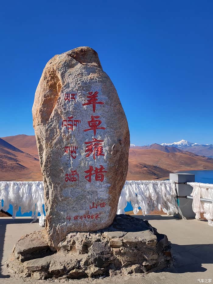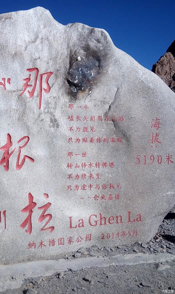 那根拉山口海拔5190米,是跨过念青唐古拉山脉去纳木错的山间通道,属于号称生命禁区的海拔5000米以上的山口。在这里可以眺望纳木错。这是一个景点,也是一个休息点。 山口立了一块标明海拔高度的石碑 山口的玛尼堆上挂满了经幡。从山口向北望去,远远可以看到碧蓝碧蓝的纳木错。