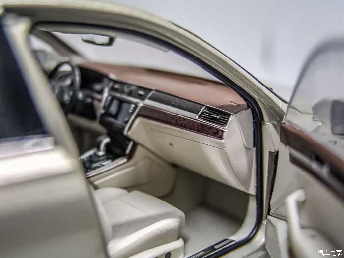 这台辉昂模型的内饰做工很棒,各种分色处理做的很棒,座椅的材质并不是普通的硬质塑料,而是那种手感很舒适,摸上去很软的塑料材质,整体整洁程度做的还不错,而且木纹板的纹路同样做了出来。