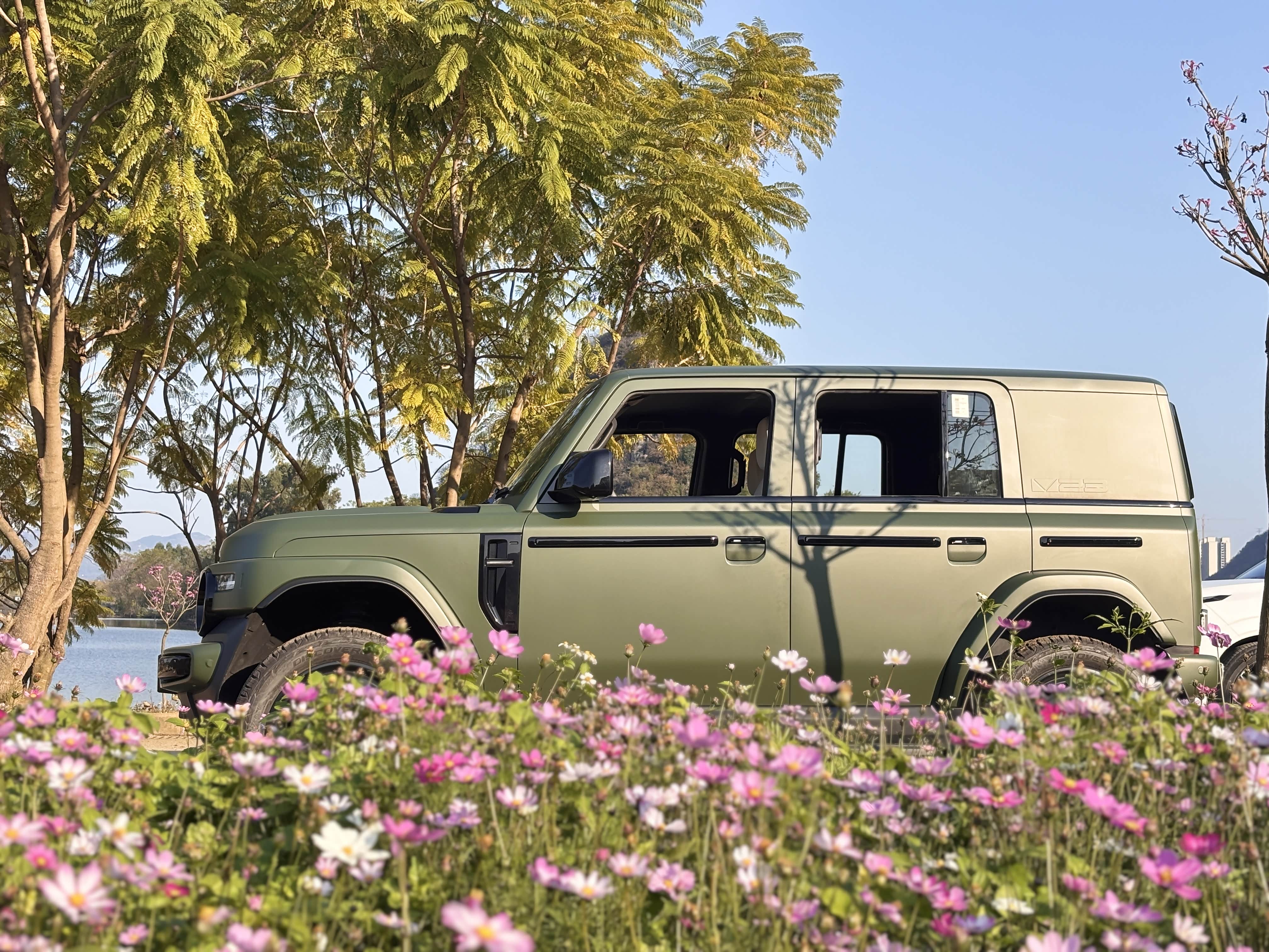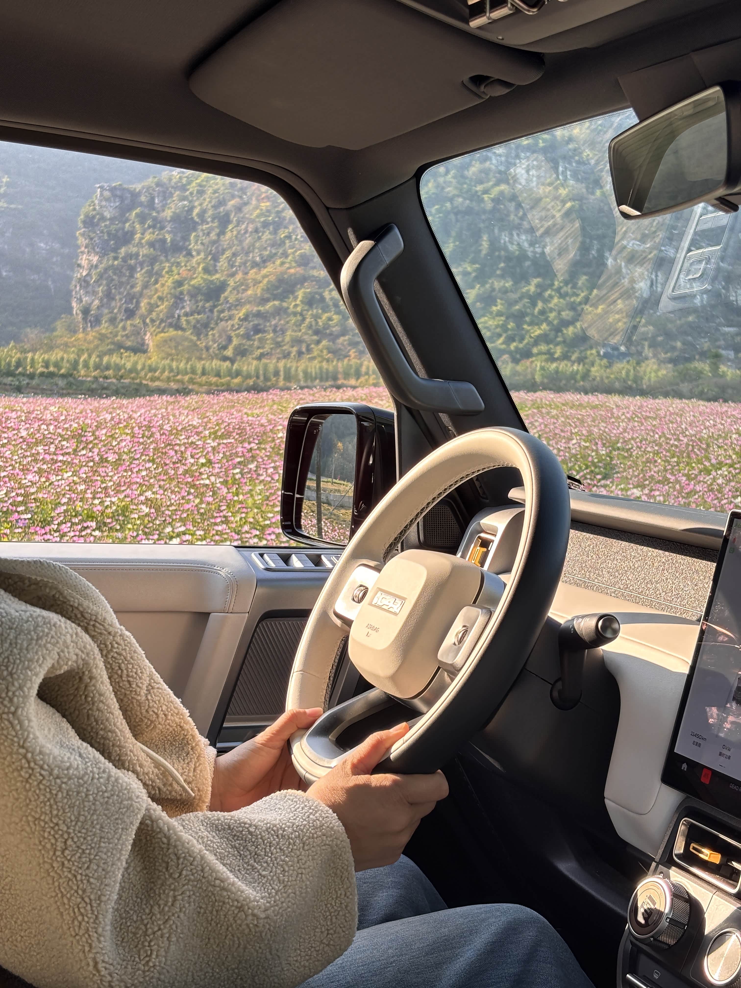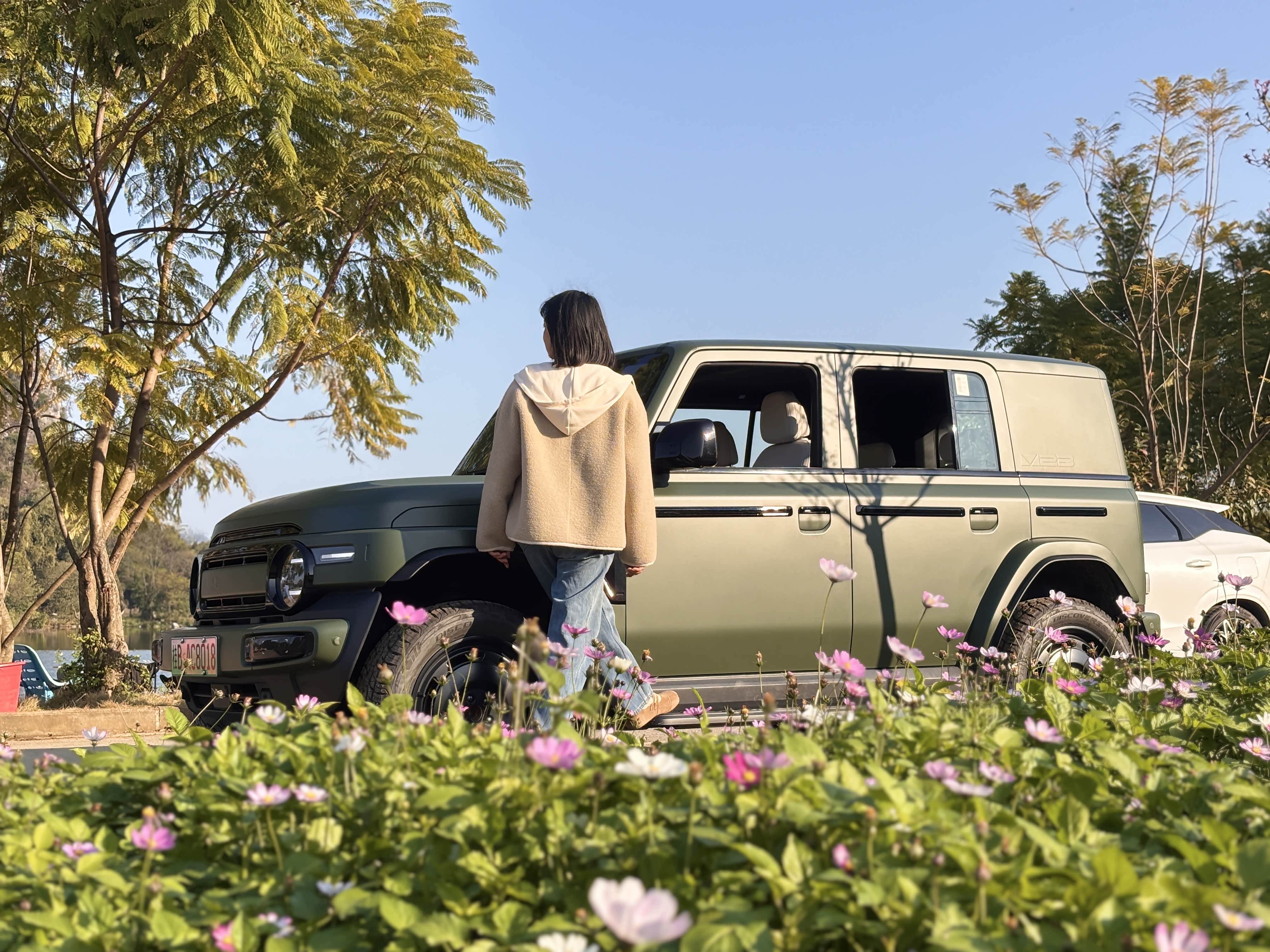 千亩湖比想象中还美。湖水像渐变的绸缎,岸边开满粉白野花。把方方正正的V23停在花丛边,硬朗线条和柔美景色意外地搭调。
