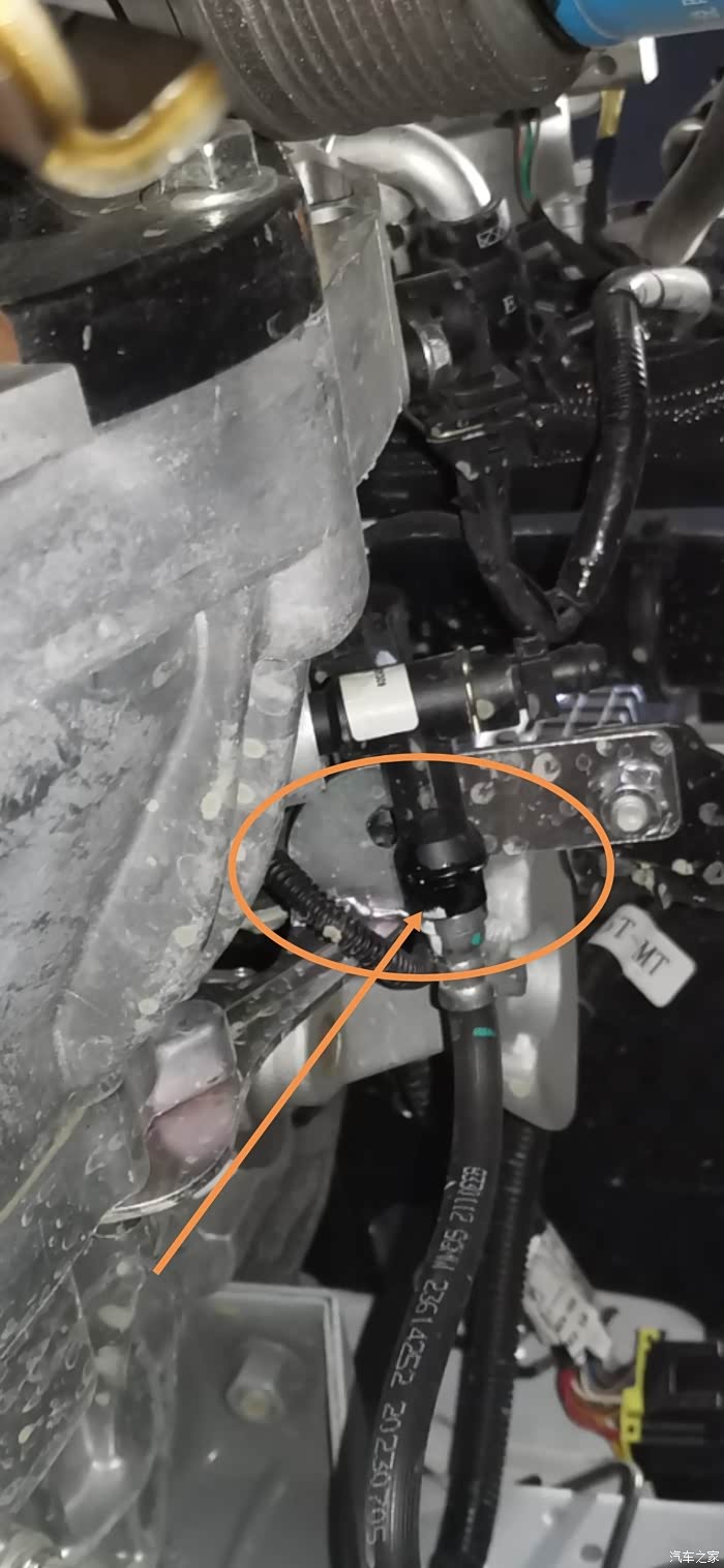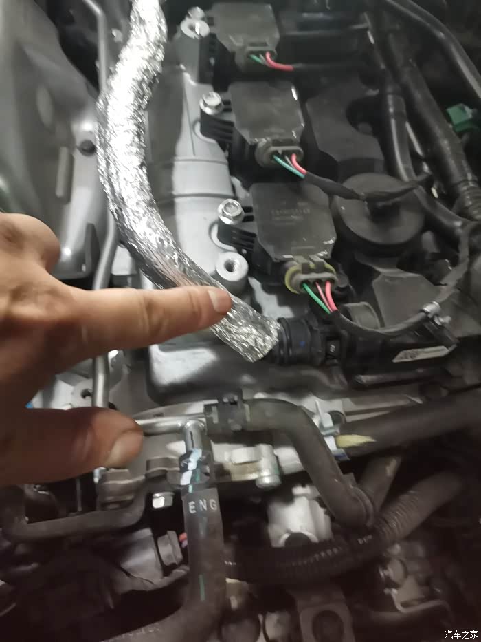 修车师傅一上来,非常肯定的说这个地方漏机油,说这个地方有水气,在东北天冷会冻,然后会堵住,让我想办法用保温的材料包上,他说只能保温,换个新管也没用,这个管,好像是发动机尾气,去涡轮增压器的管。管子外边已经包了隔热材料,修车师傅这回让包保温材料,但是后来啪啪打脸,竟然是漏刹车油。