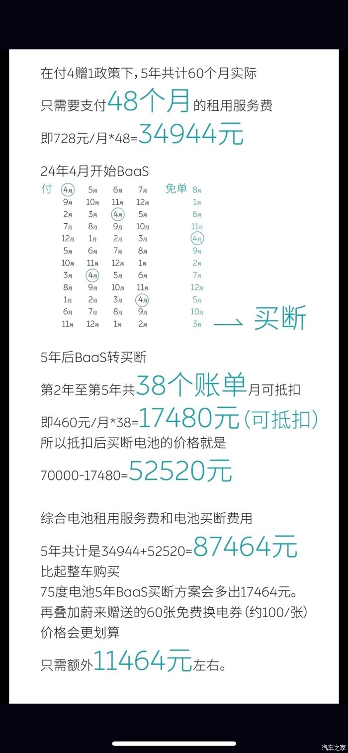 梳理一下蔚来的BAAS租赁政策:75度租电方案是728/月。租四免一(租4年免1年),