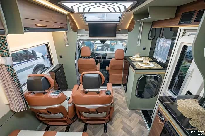 走进FT800的内部,会发现生活区的布局精巧而灵活。会客厅区域采用少见的双排设计,前方配有两个航空座椅,具备通风、加热、按摩功能,还有一键零重力模式和手机无线充功能,能为驾乘者带来极致舒适体验;后方则配置了单排双人座椅,整车可实现6人的核载。这种设计不仅解决了核载人数的问题,还充满了创新性。副驾驶座椅可旋转,与后排座椅形成一个舒适的会客区域,方便办公、交流。