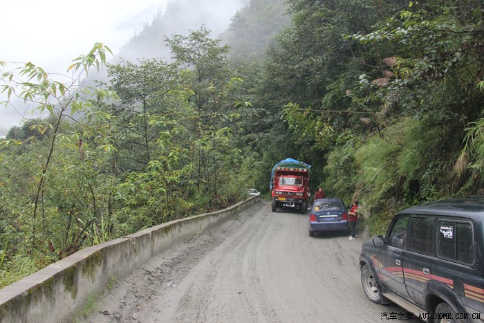 因为时间早,我们可以缓慢的挑路而行。其实我的照片不能体现通麦天险的十分之一,轿车走这样的路,即使缓慢,依然是很受伤,有两个狭窄的陡坡,轿车边打滑边爬行,前轮卷起的裹带着泥浆的沙石飞溅到前挡风玻璃上,让人心惊肉跳,我已经吓的双手紧握扶手,两眼紧盯路面,大气也不敢出,那里还顾得拍照呀!但见我的副驾,神色沉静,动作娴熟,换挡、加油、方向盘快速的拨动,所有的动作一气呵成,仿佛和驾驶的车辆已经融为一体,硬是没有托底地过了一个又一个险象环生地路段,真是不服不行呀!