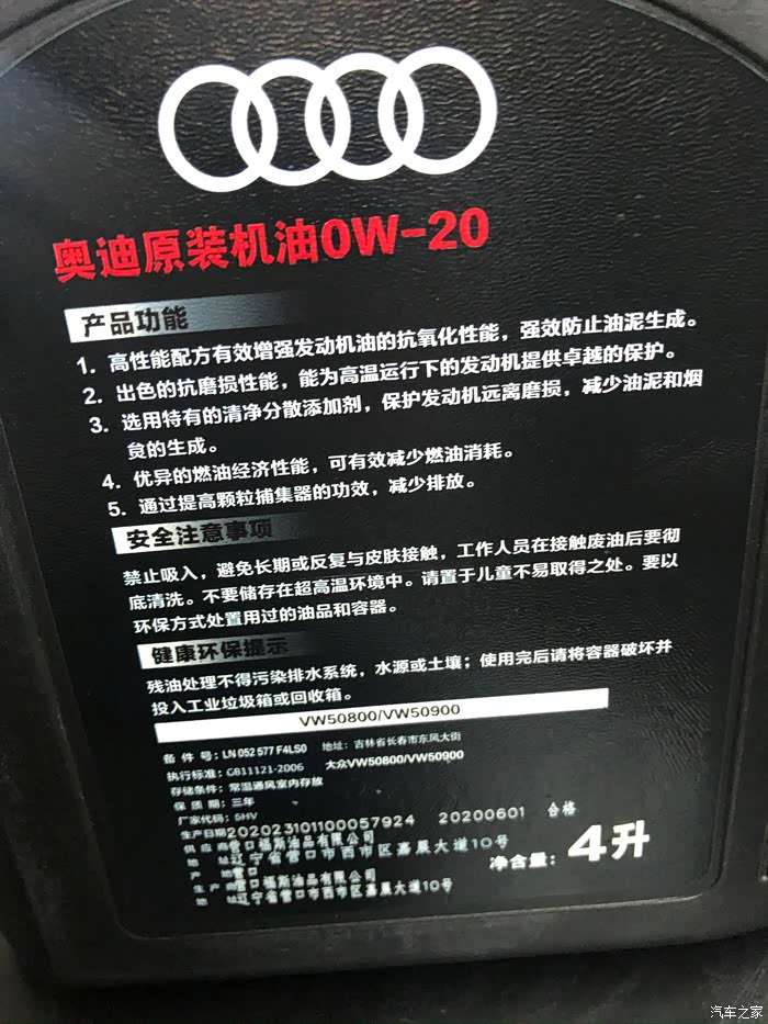 加注口写着0W-20,或者PR号有4BD的必须用VW50800机油(注意要认50800,而不是认0W-20,不含50800认证的0W-20不允许使用)。