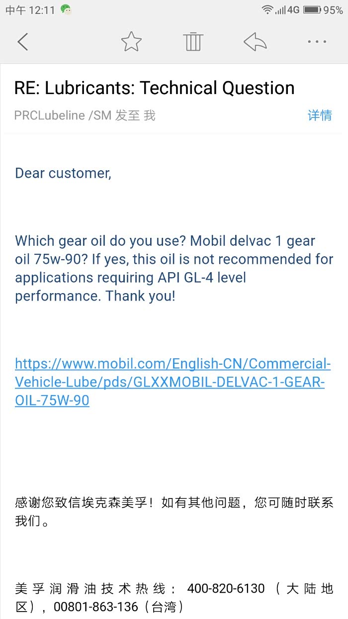 昨天刚刚更换了手动波箱油,油是美国进口的美孚一号GL-5 75W-90齿轮油。看到好多人都到反应GL-5不适合轿车的手动变速箱,我上网查了查,有说不可以的,也有说可以的,所以,我蒙了。为了一探究竟,我咨询了美孚官方,也顺便把这个疑惑给大家解了。
