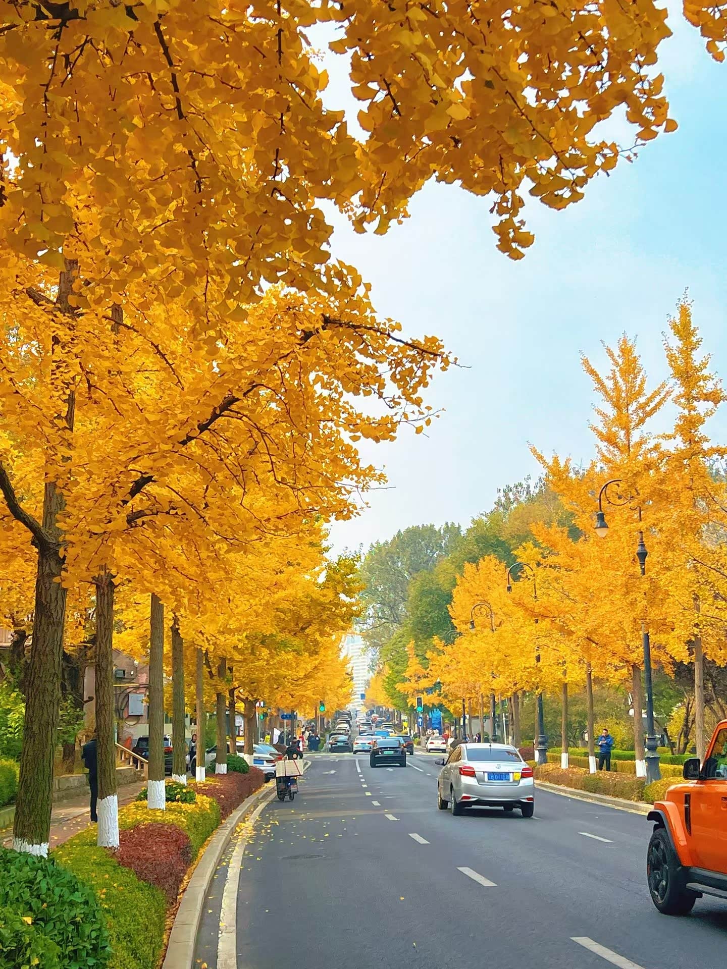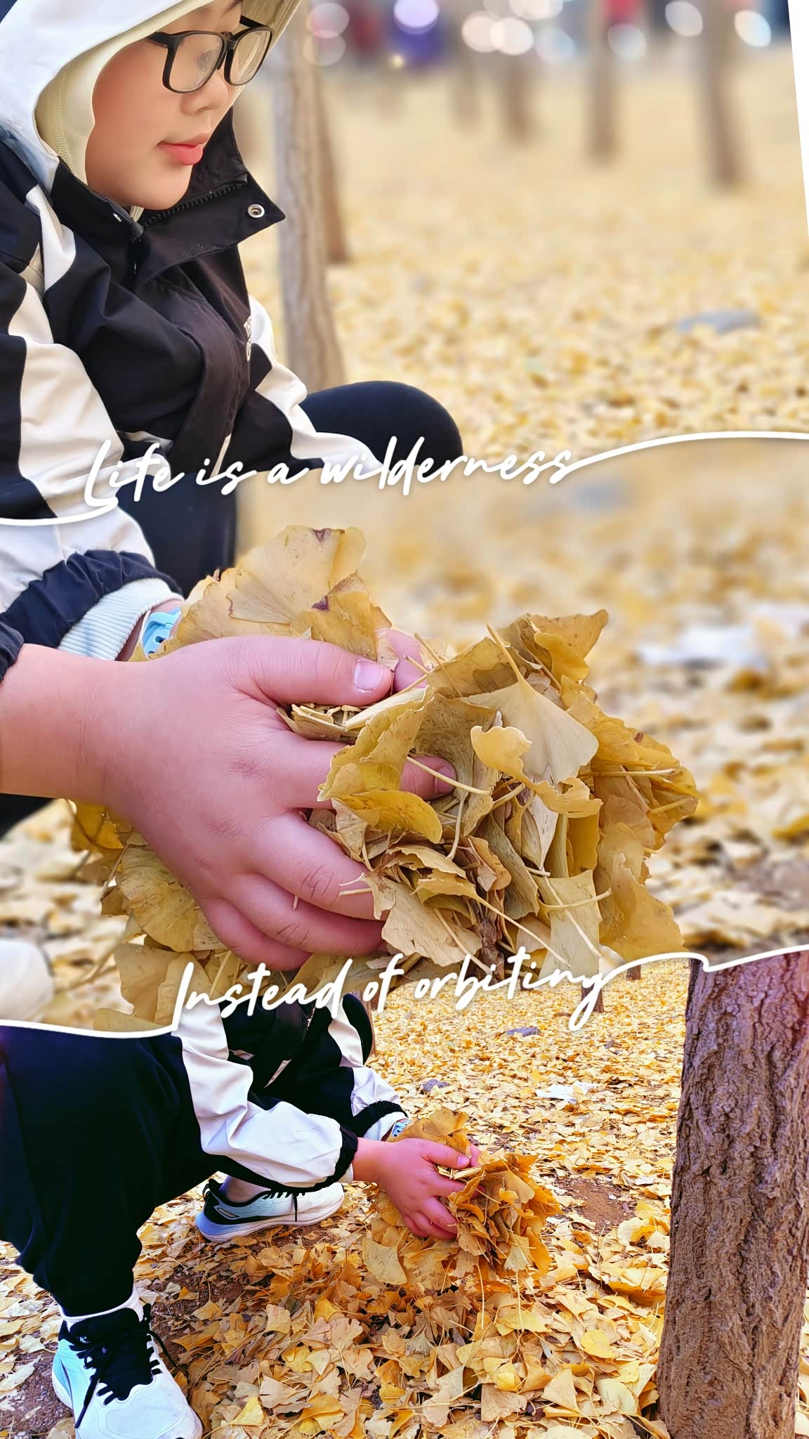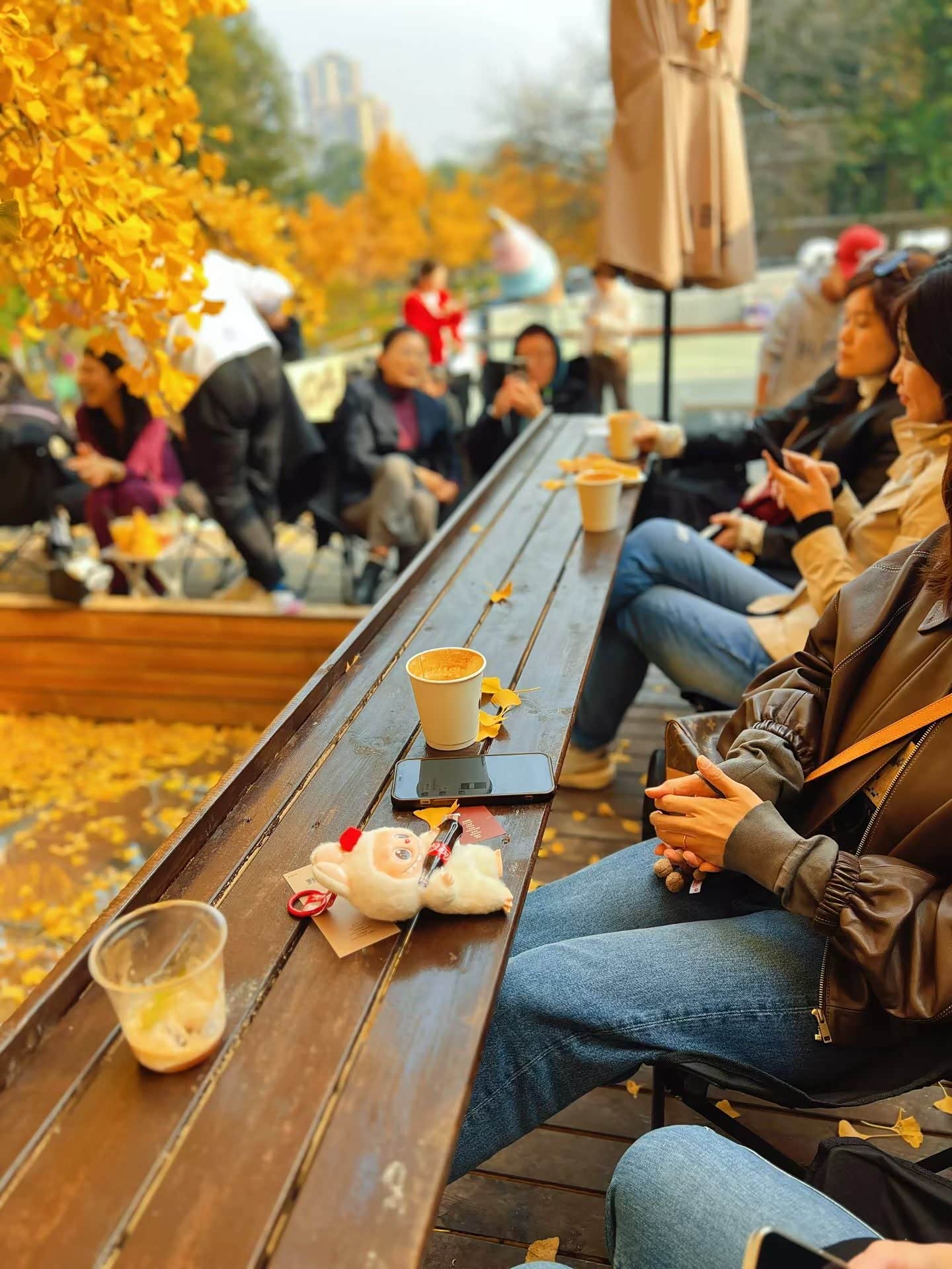 终于抵达心心念念的银杏林,远远望去,成片的银杏树撑起一片金黄的天空,阳光穿过枝叶缝隙,在地上投下斑驳的光斑,像撒了一地碎金。孩子推开车门就像脱缰的小马,欢呼着冲进林子里,踩在厚厚的银杏叶上,发出“簌簌”的声响,清脆又治愈。我停好车,循着空气中的咖啡香往前走,两棵老银杏树下藏着一家露天咖啡馆,折叠椅、暖炉搭配着飘落的金黄,几个年轻人举着咖啡杯抓拍银杏叶落在杯沿的瞬间,氛围感拉满。