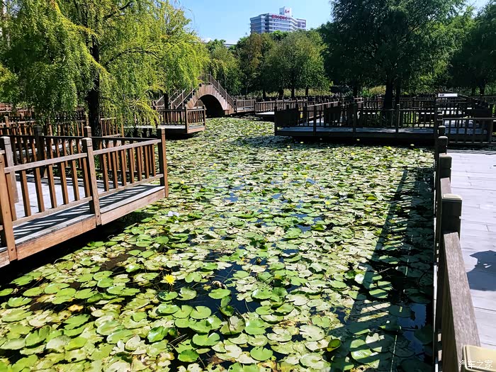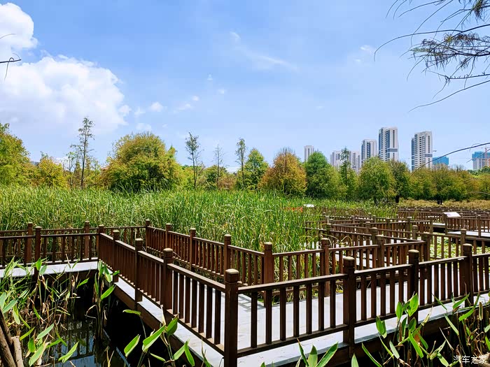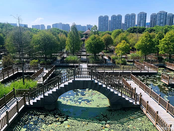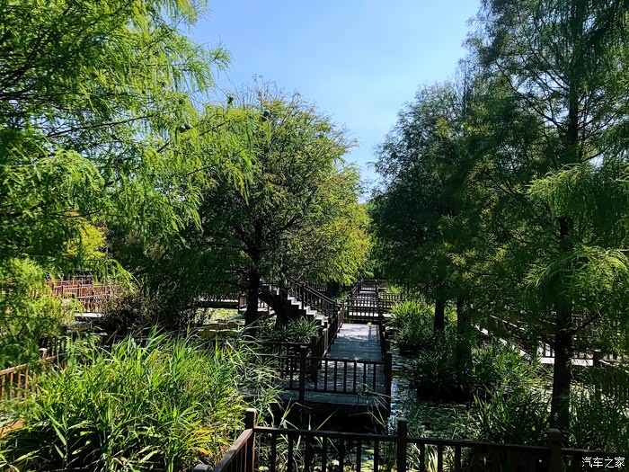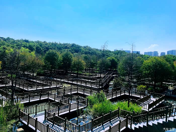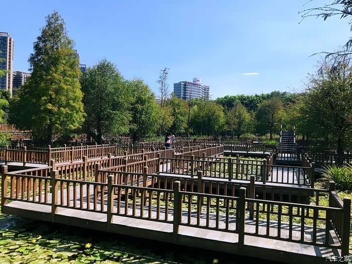 而在这块湿地之上,最夺目最具备价值的要数建在湿地之上的防腐木迷宫了。这一大片几乎覆盖了大半个湿地公防腐木迷宫栈道,纵横交错,结构精巧,充分彰显迷宫“迷”的特点。防腐木栈道围绕着中心防腐木圆亭展开,迂回曲折,呈现复杂巧妙的迷宫布局,非常别具一格。