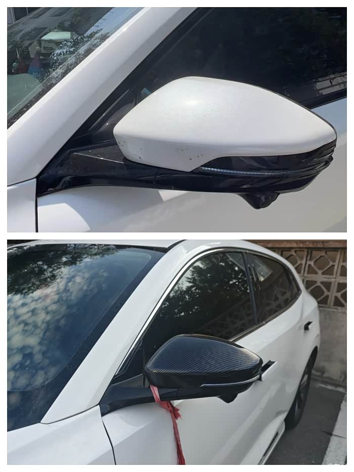 2.后视镜,我在后视镜外面加装了一个碳纤维外壳,使得后视镜和车身颜色白黑配色,碳纤维外壳既增加了外观的硬朗风格和美观,又能防止原车的后视镜出现刮擦。