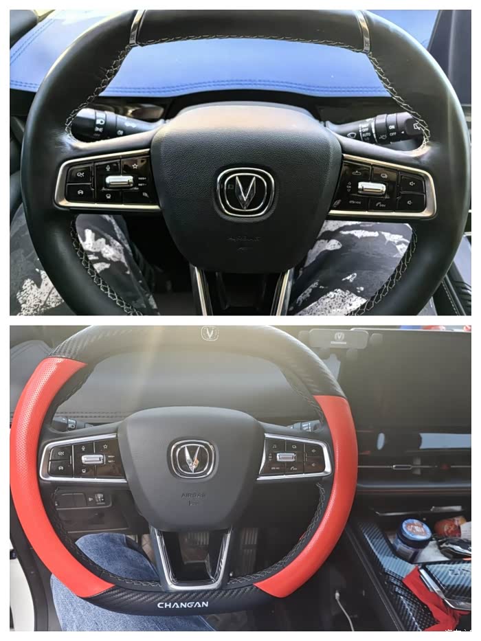 1.方向盘把套,我最喜欢的红黑配色,相比素车的方向盘,加大了握感,使驾驶体验更加有感觉。把套的的下方带有长安定制标志,更加符合气质。