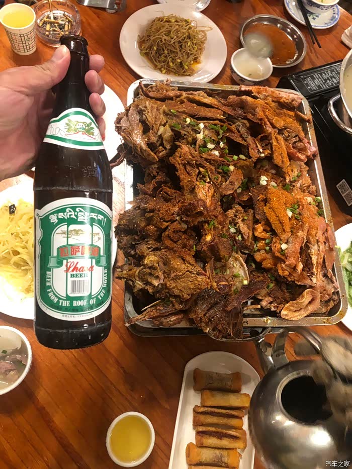 拉萨啤酒、藏香猪、烤全羊,不高反的朋友可以畅饮。(在这里说一下到了拉萨当天不要洗澡!不要饮酒!休息调整一晚第二天再遛这样会很大程度上缓解高原反应的)。和我们一路的另外一部丰田路巡车上的三个人,由于高原反应非常的强烈,然后第二天就坐飞机回去了。