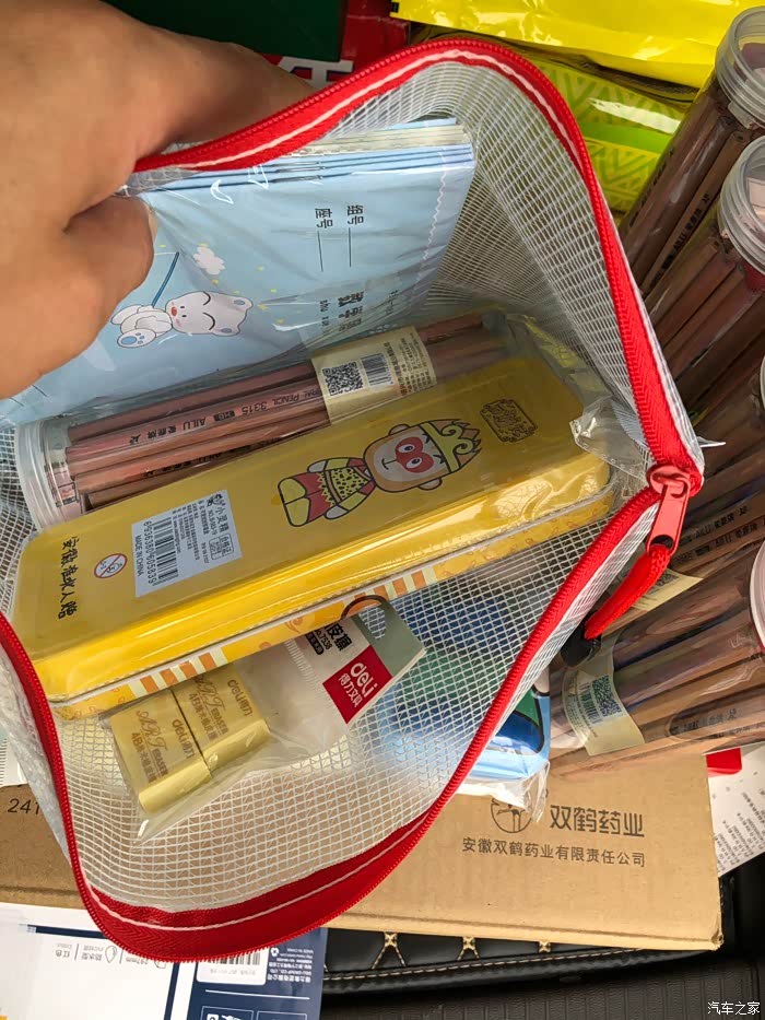 每袋内两块橡皮,一筒铅笔,一个铅笔盒,一个削笔刀,练习本10个。