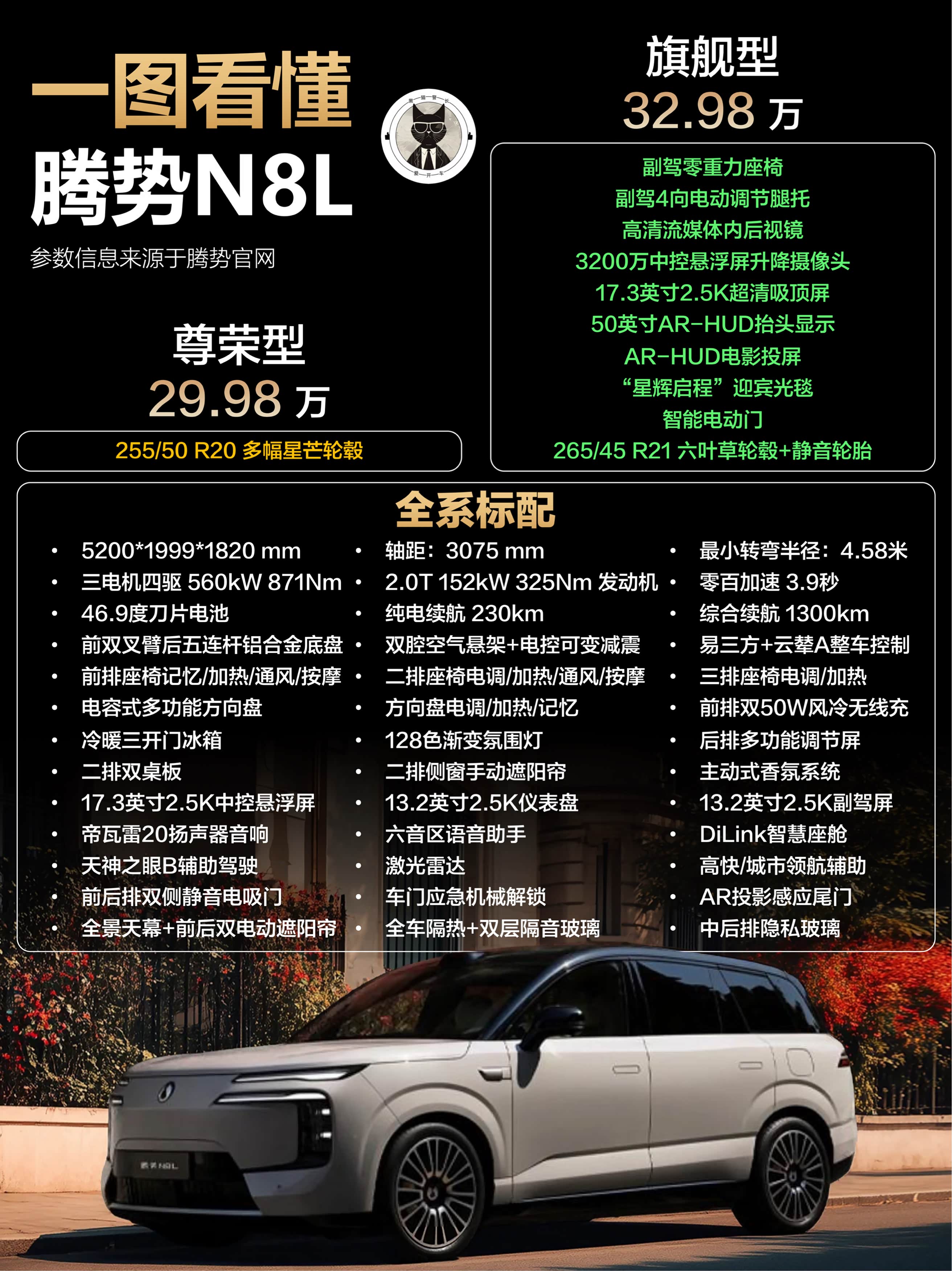 今年国产大型SUV跟下饺子一样纷纷亮相,腾势N8L也来凑热闹,尺寸仅略逊于大哥腾势N9,搭载云辇A➕易三方➕天神之眼B激光雷达方案,起售价不到30万,你觉得竞争力怎么样❓