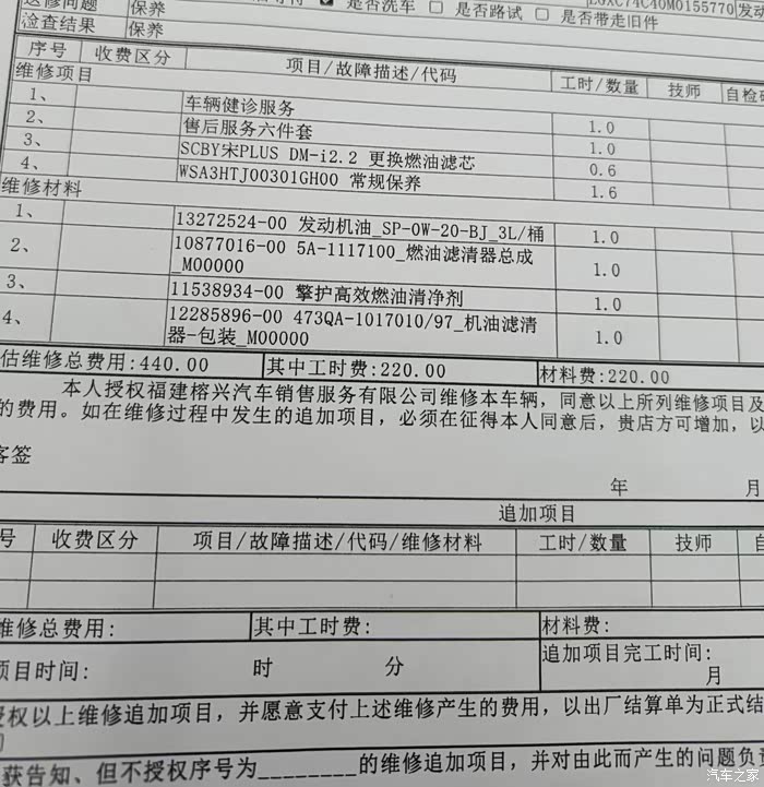 今天保养券用完了,才保养的,因为里程够大了,要换燃油滤芯了, 一黄440块。 工时220,材料220. 不换燃油滤的话370多