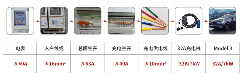 本文以家用220V/32A、功率7kW充电设备安装的典型配置介绍特斯拉充电的配置要求: