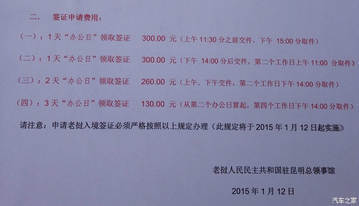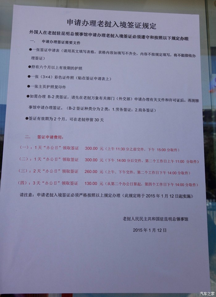 以前看着论坛里各位TX自驾游老挝泰国的帖子心里总是莫名的激动,8月刚好儿子初中毕业,中考完毕没有暑假作业,提前一个月计划了一下,首先是把大学毕业后逐渐生疏的英文恶补了一周,然后去老挝领事馆(在彩云北路世纪金源酒店旁)去把老挝的签证办了(注:办理签证按照正常时间3天拿160元/人,办理急件1天拿300元/人)。