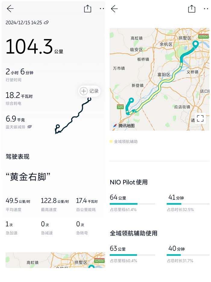 冬天确实也是电车的冬天,是电池特性问题,我的蔚来ES6那天跑了城区路段+高速,总共104公里,最后电耗是显示18.2度,折合百公里电耗是17.4度,是不是还行?