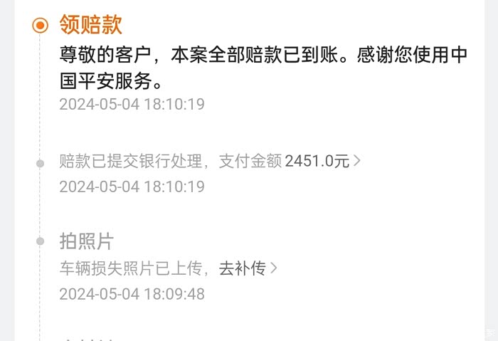 费用清单:玻璃更换物料费+人工费一共2451元,前档玻璃膜1200元,赔付方式是保险直接打款到4s店,期间无异议,4s维修还是尽职尽责,维修完并提供了雨水测试和洗车服务