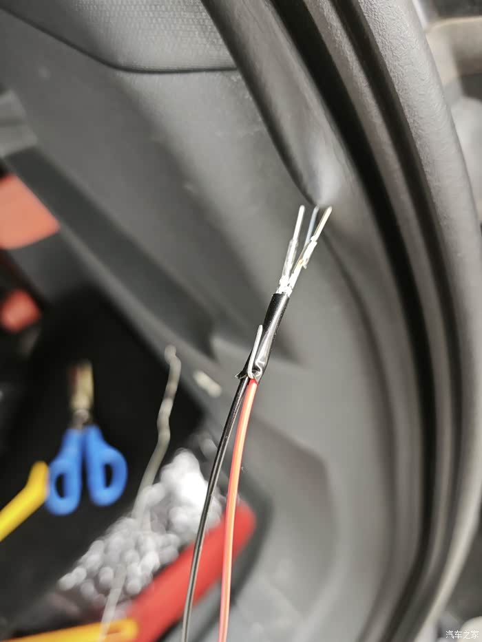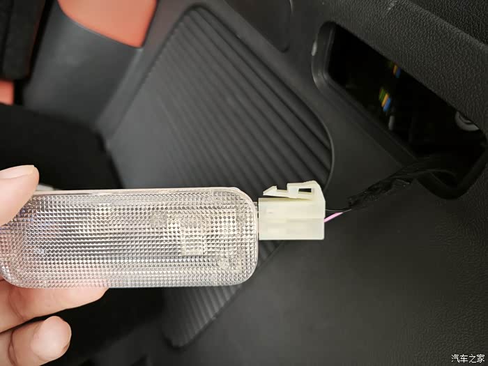 将插针插入原车端子试电区分正负极,如果不亮就是插反了,将插针对调即可,正常亮灯再进行下一步:穿线