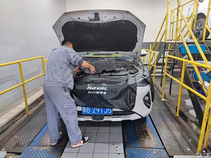 打开发动机舱盖,找到空气滤清器的位置。哈弗F7的空气滤清器位于发动机舱的一侧,由一个黑色的盒子盖着。取出来以后发现还不太脏,所以吹了吹继续用。动手能力强的车友也可以自行更换。