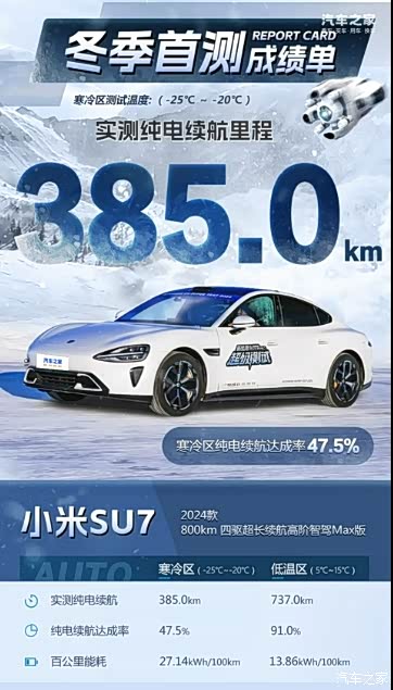 更让我惊讶的是,在寒冷区-25至-20摄氏度的超低温环境下,小米SU7的续航里程依然能达到385公里,续航达成率为47.5%,同样位居第一,比第二名多出48.8公里。这个成绩要比其他车型牛太多了,同时用实力证明了小米SU7在极端寒冷条件下的超高性能。
