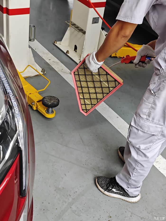用气枪进行清理。这一次暂时不更换,但是稍微进行清理也是有必要的。下次保养的时候就需要更换了。