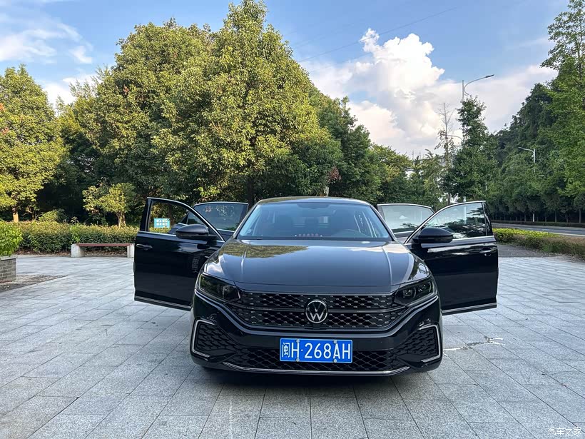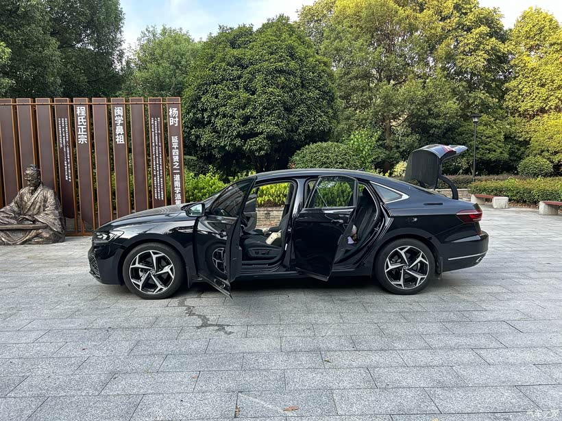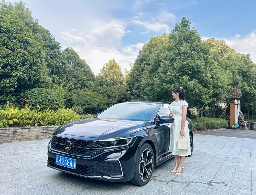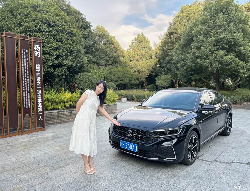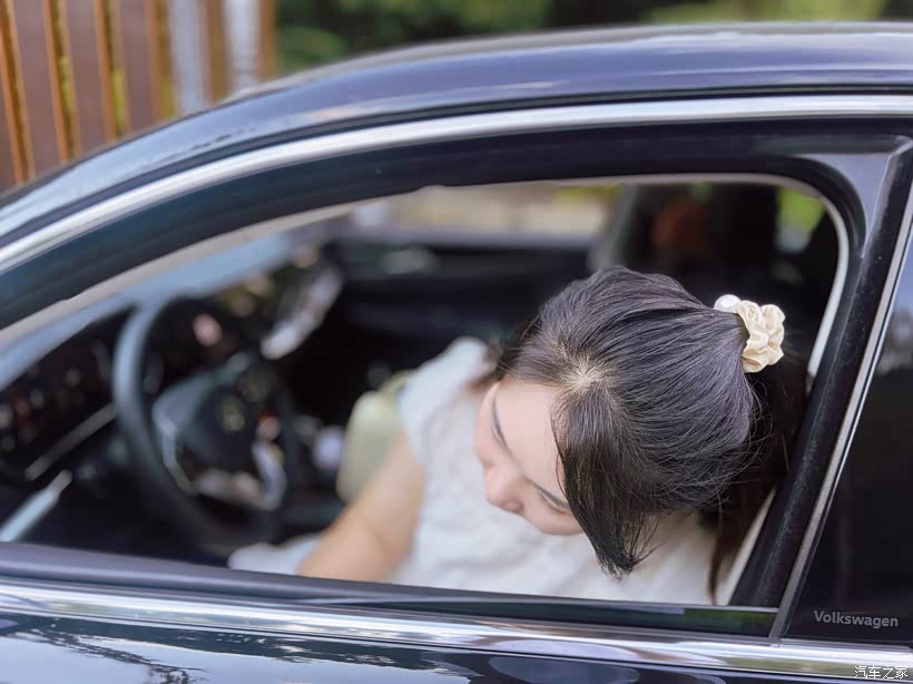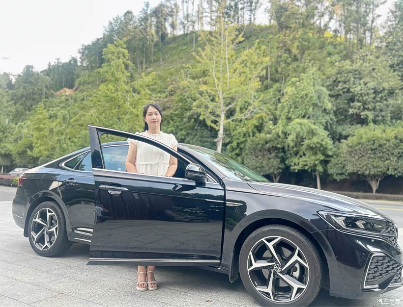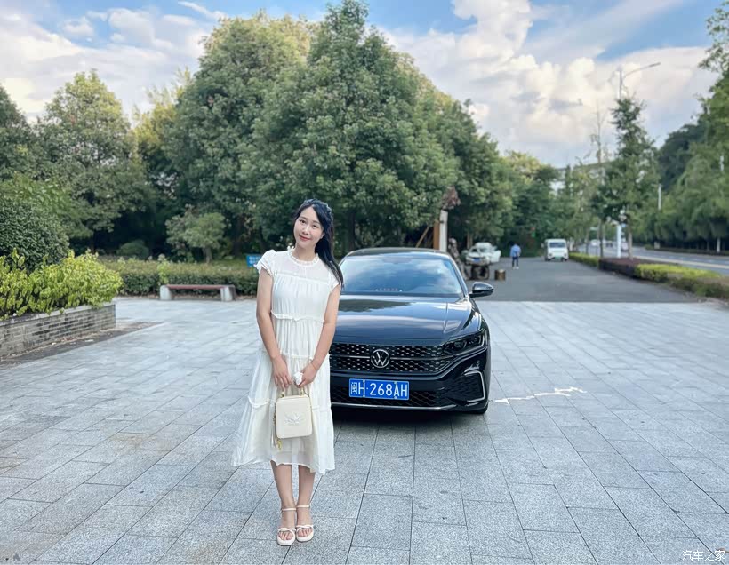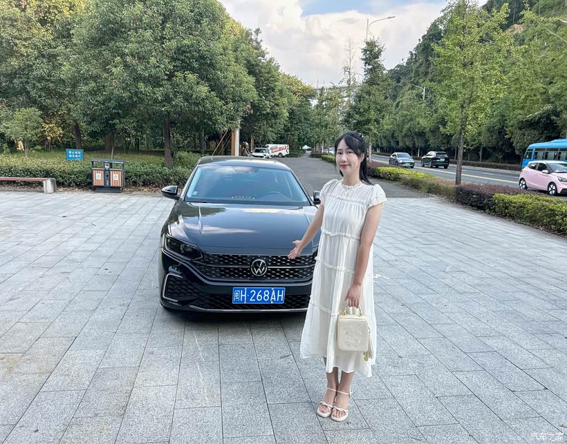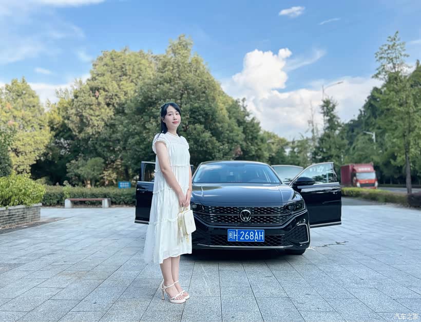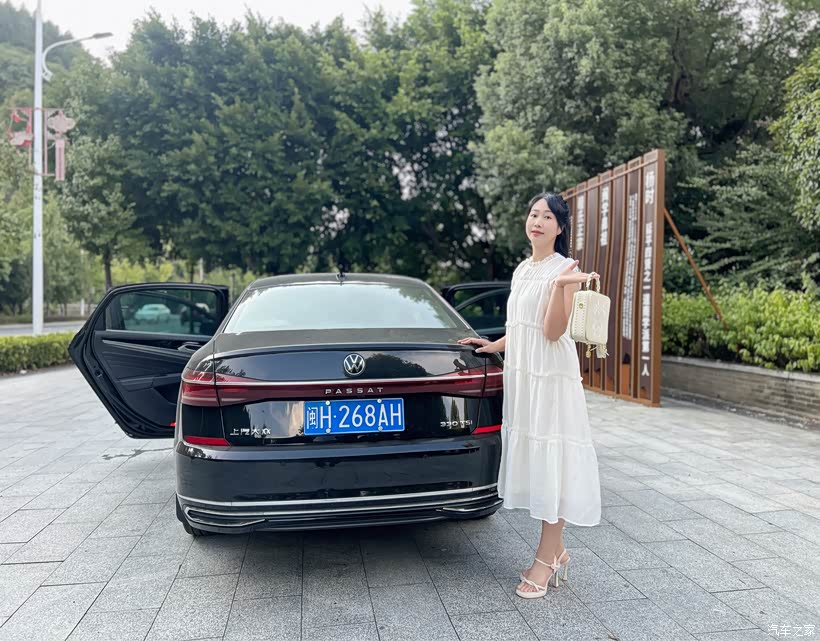 接下来上正片,大家多担待我这拍照技术,都是用水果手机拍的,没加任何美颜特效,毕竟我媳妇这颜值,根本不需要滤镜。她现在开的是2023年是7月上牌的帕萨特,当初选车时她还纠结“太商务”,结果开俩月就真香了,说:“坐着舒服,中控屏好用,带闺蜜出门还显档次”,黑色的车身和媳妇的白裙子搭配还挺出片的。