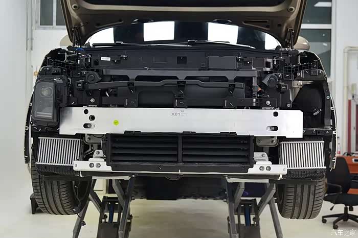 拆掉前保险杠,内部有一根非常粗壮的铝合金防撞梁,厚度为4.71毫米,能覆盖车头的74.81%,截面呈“目”字形。