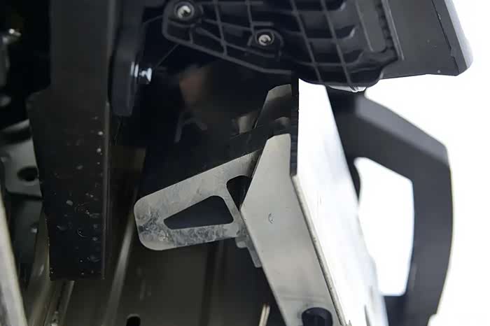 前防撞梁两端各有一个三角形铝合金“碰撞诱导块”。在25%偏置碰撞测试中,能让车辆偏转,降低正面冲击力。