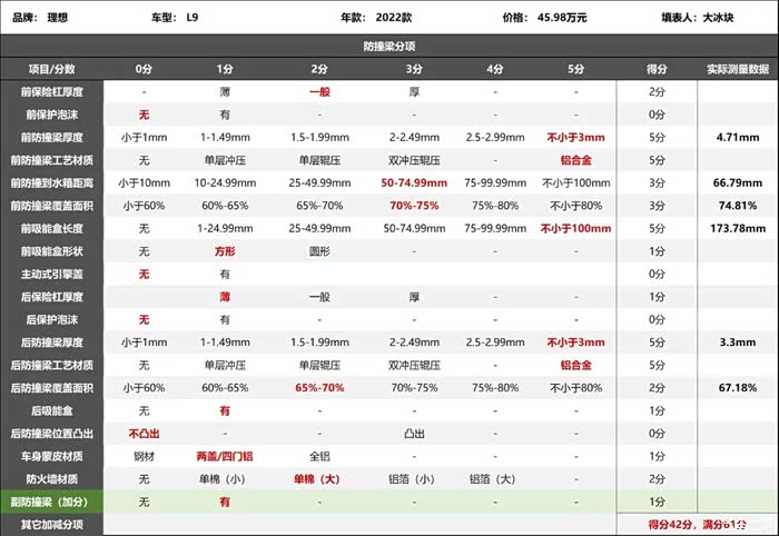 2022款理想L9防撞梁评分