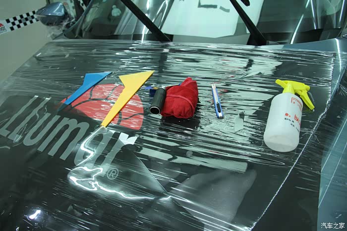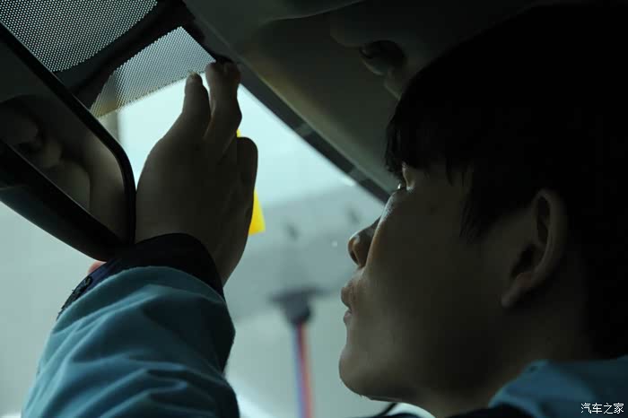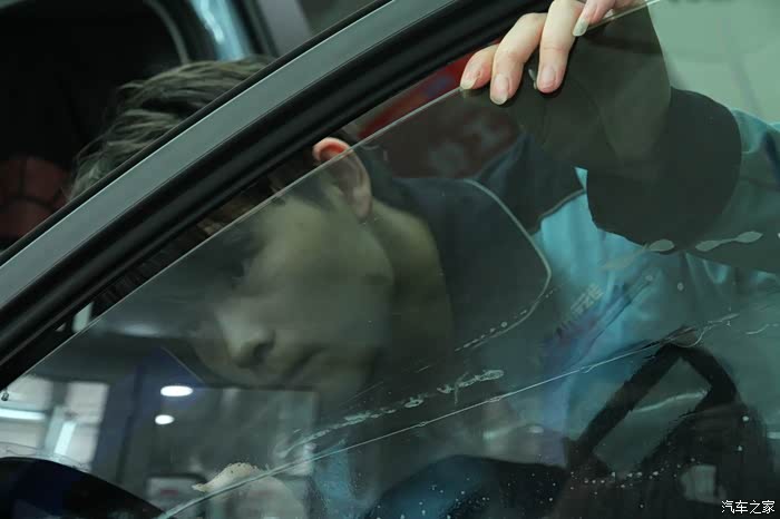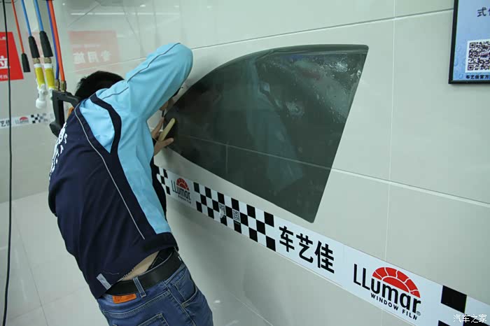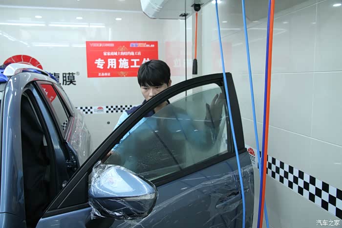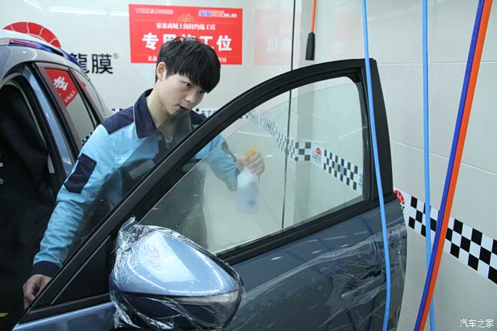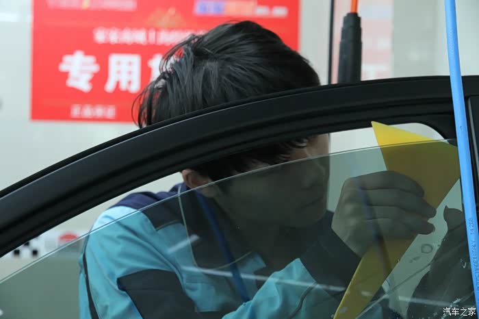 开始贴膜拉~,先用塑料纸保护车门内饰板,然后用刮板和水清洁车窗和玻璃槽,撕掉贴膜后面的一层,然后喷上水,也在玻璃上喷上水,把贴膜附上去,对比位置,用刮板把水刮掉,看似简单的动作,但要一次做好需要师傅的绝对耐心、细心和经验哦