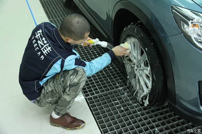 第一步先把车身洗干净,贴膜时车身上灰尘也会影响到贴膜的质量,两个师傅同时上手,效率是灰常高啊~ ,商家清洗轮毂时用的是低压水枪,而且清洗的非常仔细